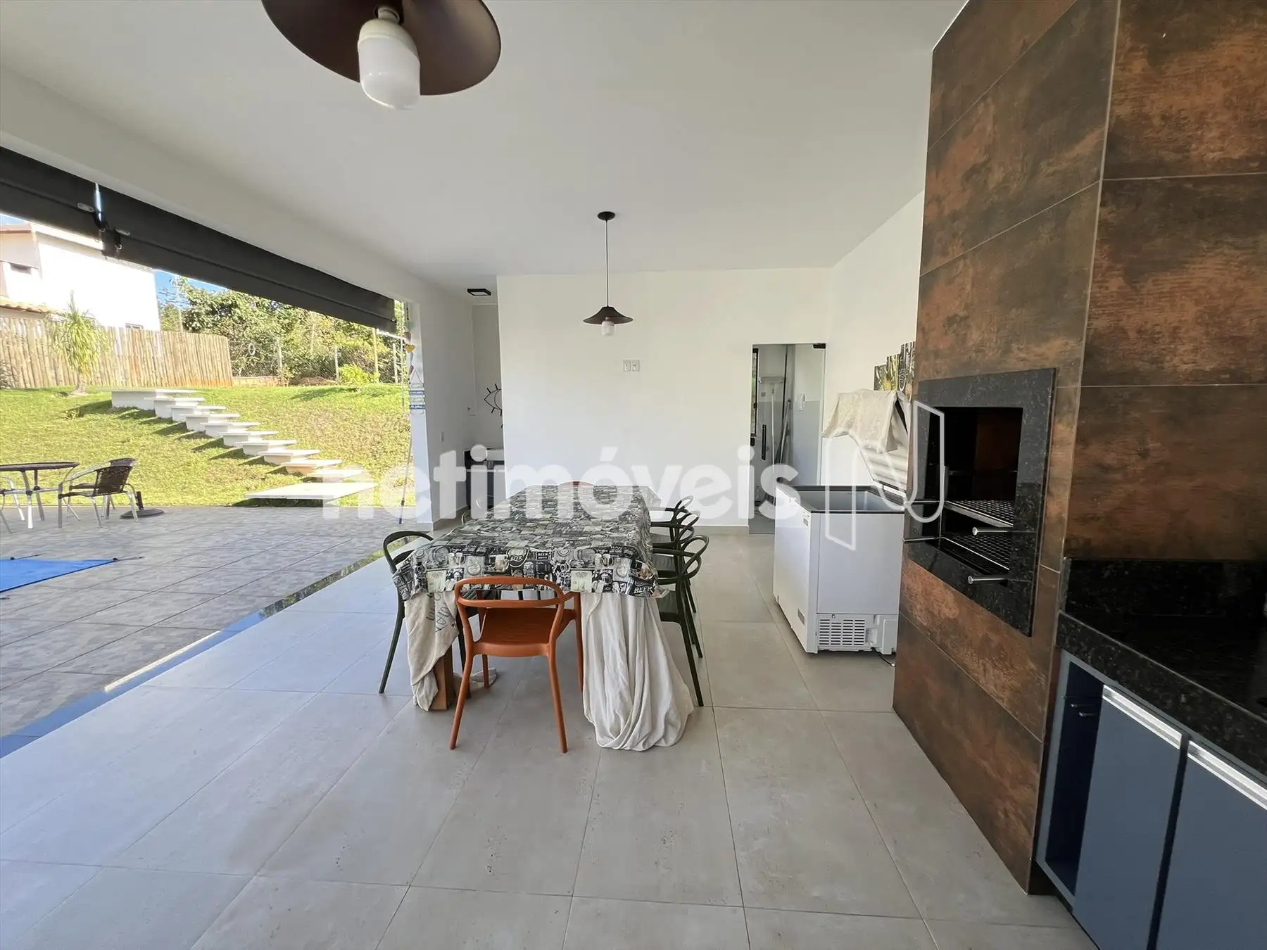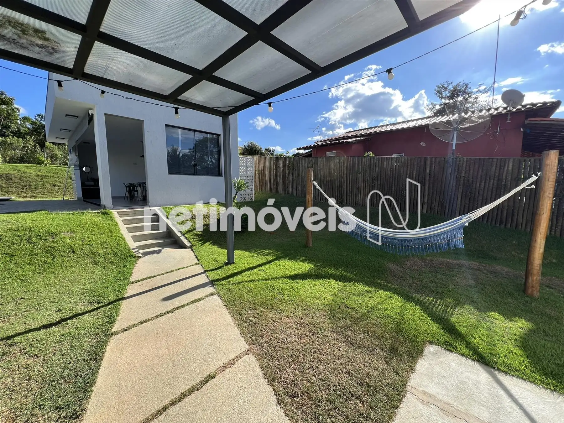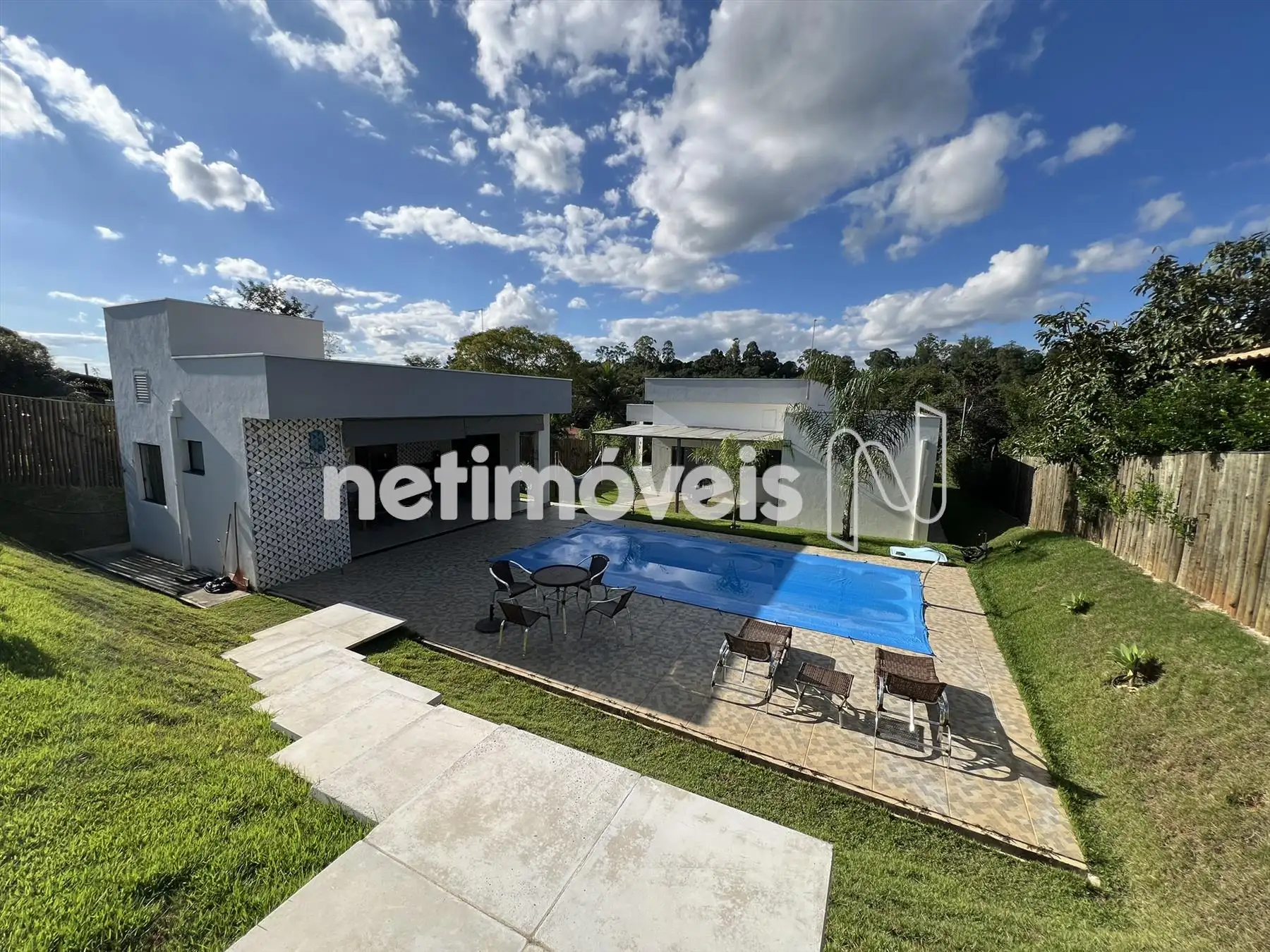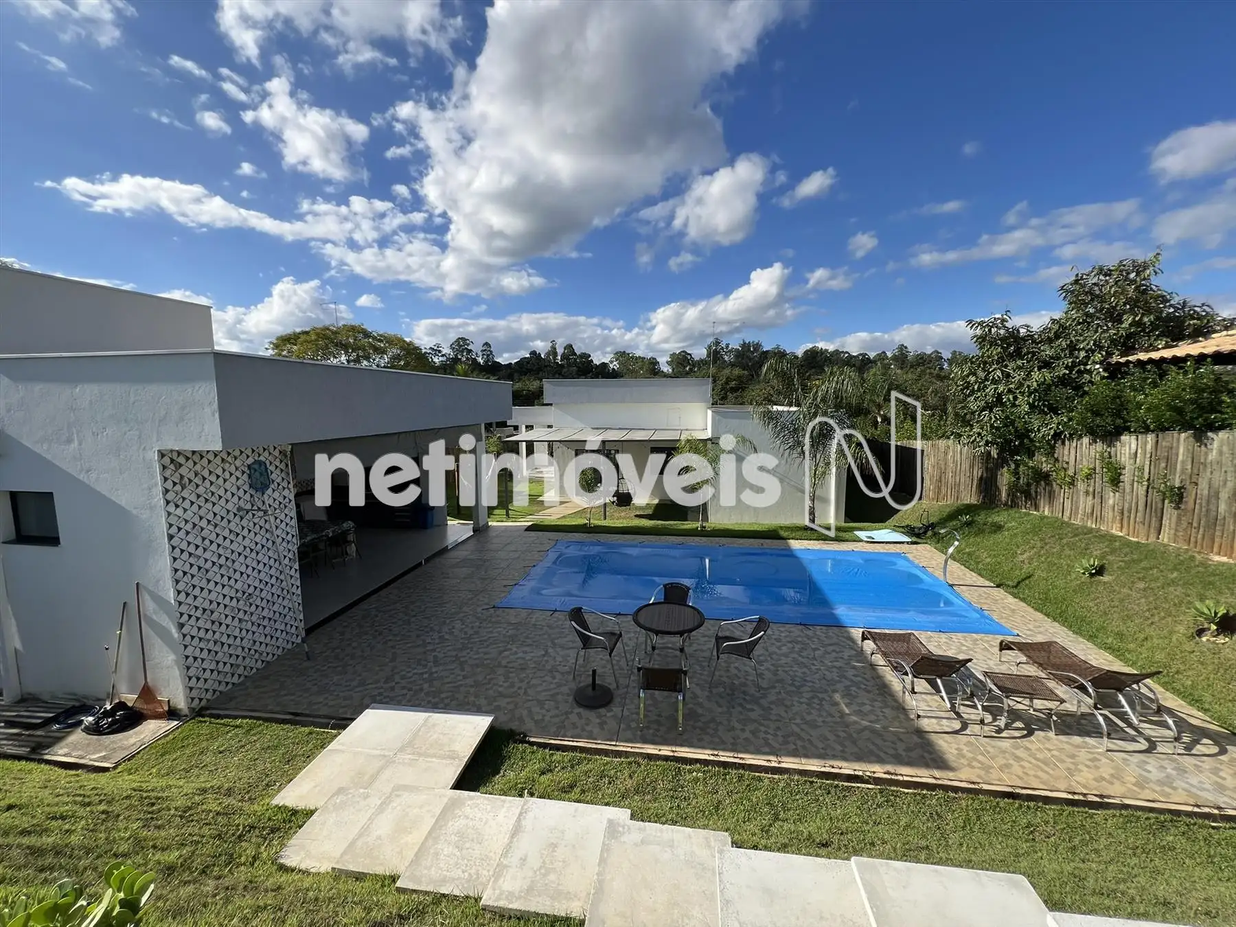 Espaço gourmet, churrasqueira com bancada de granito e armários, piscina, pergolado, campinho gramado e toda casa feito paisagismo