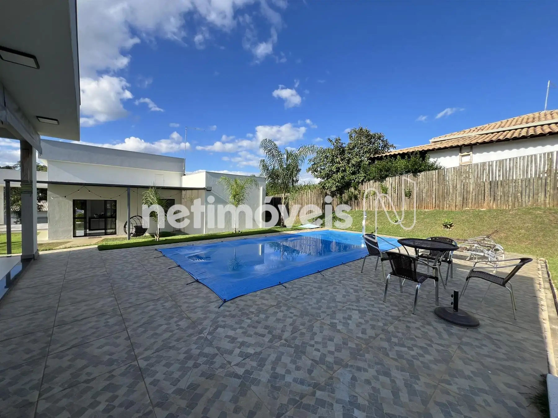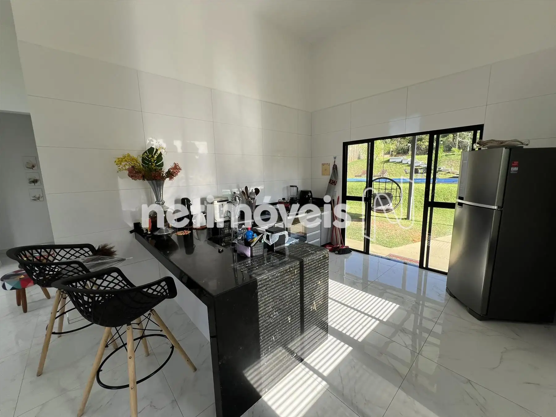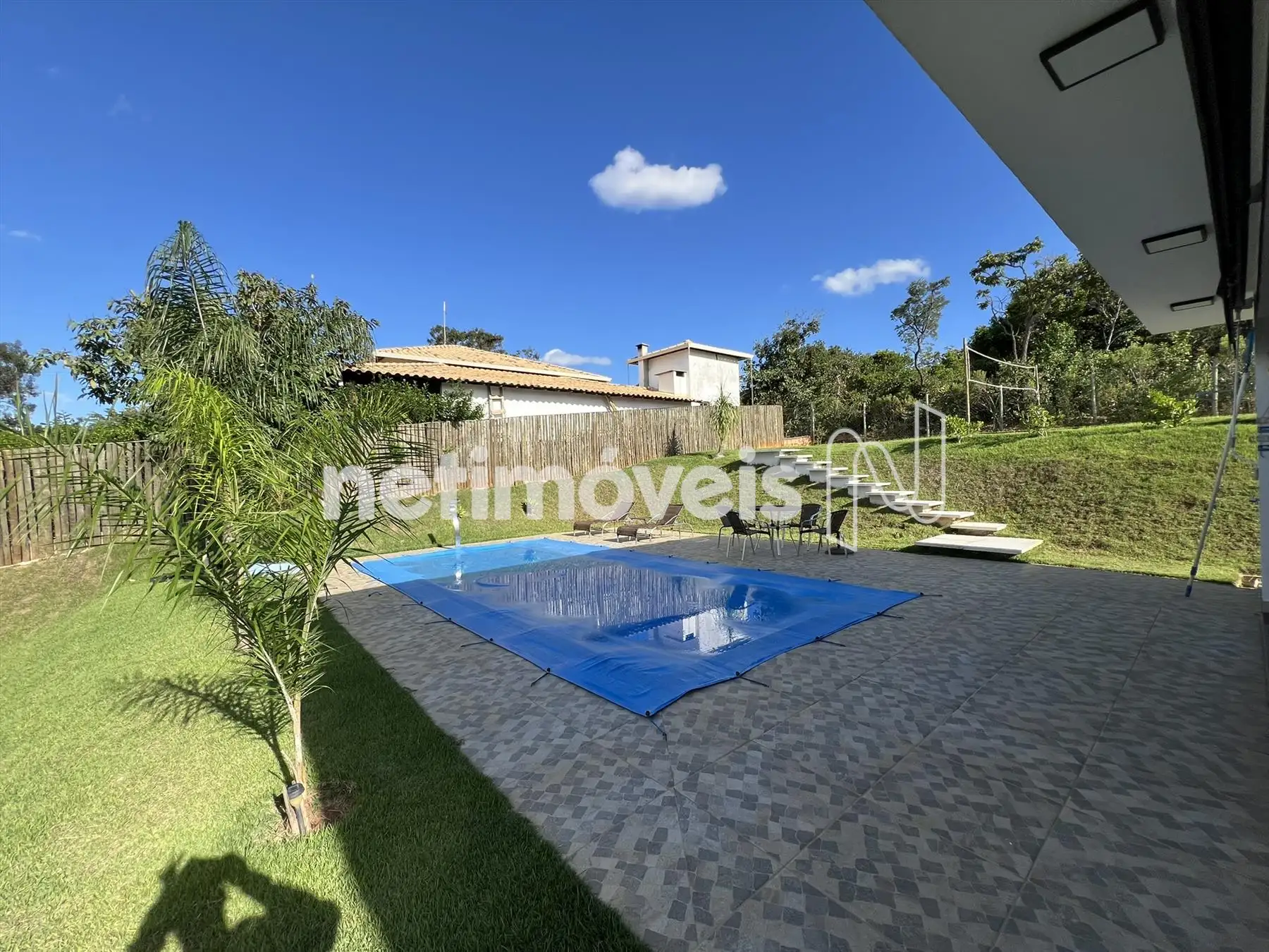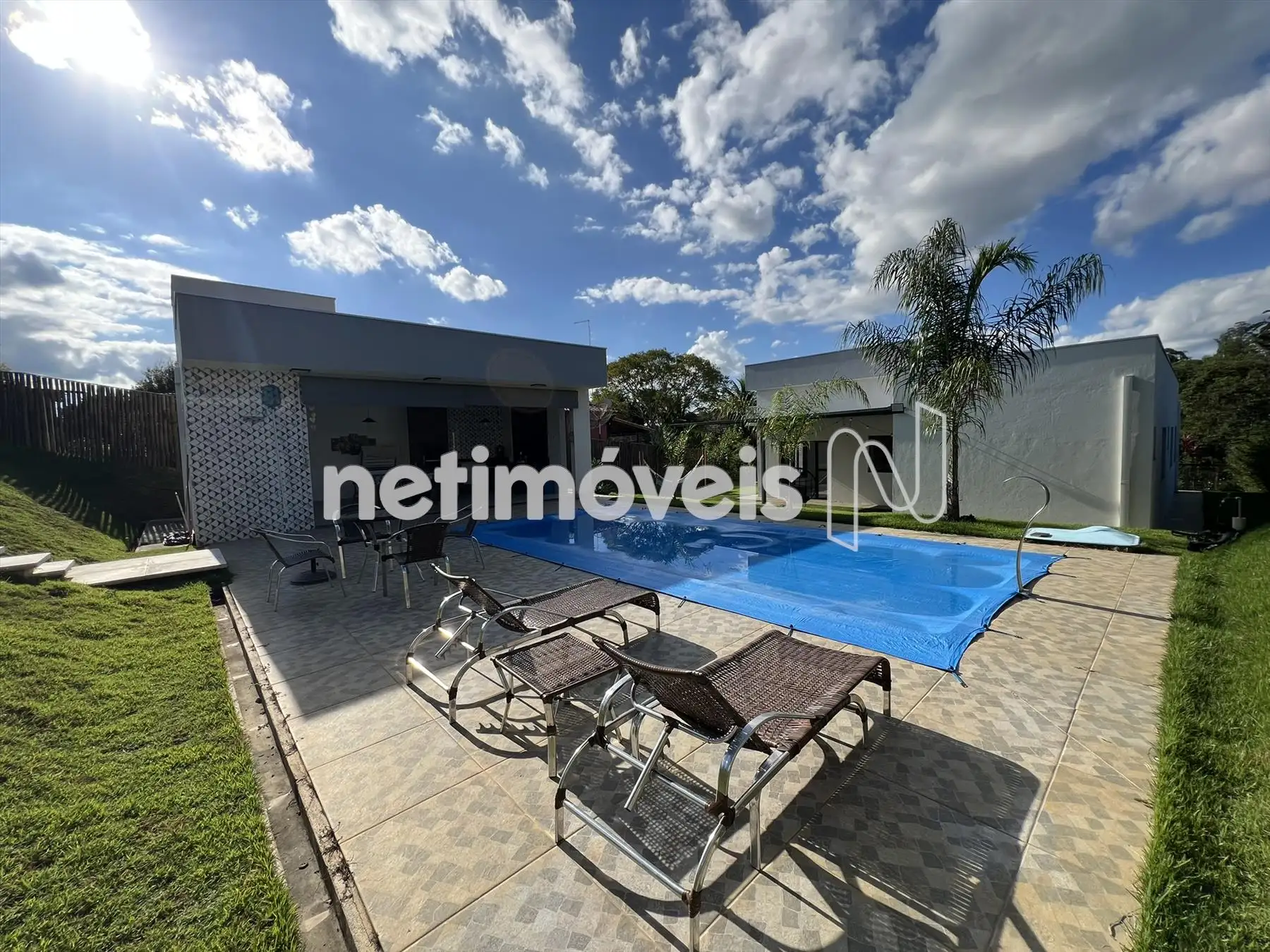 Espaço gourmet, churrasqueira com bancada de granito e armários, piscina, pergolado, campinho gramado e toda casa feito paisagismo