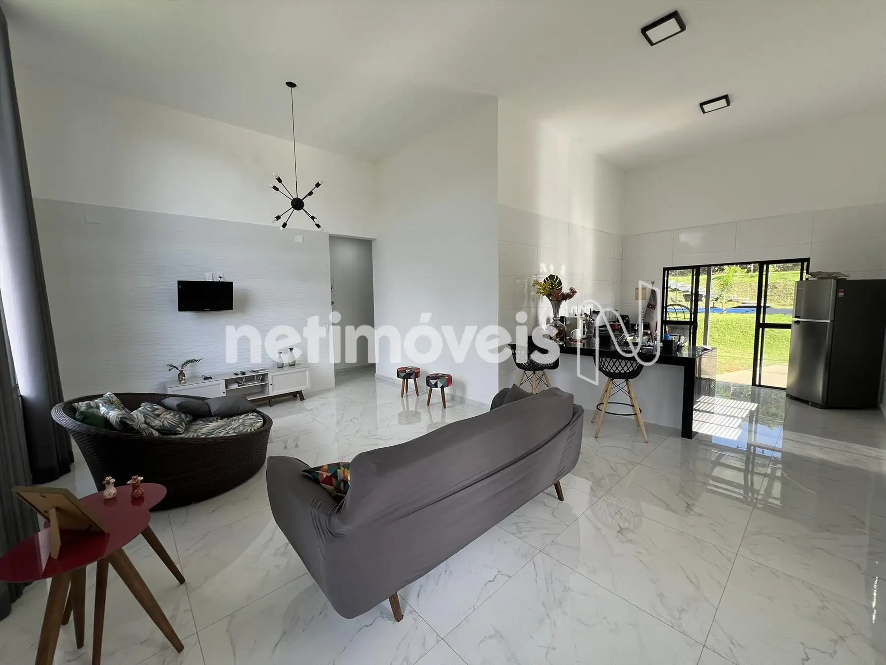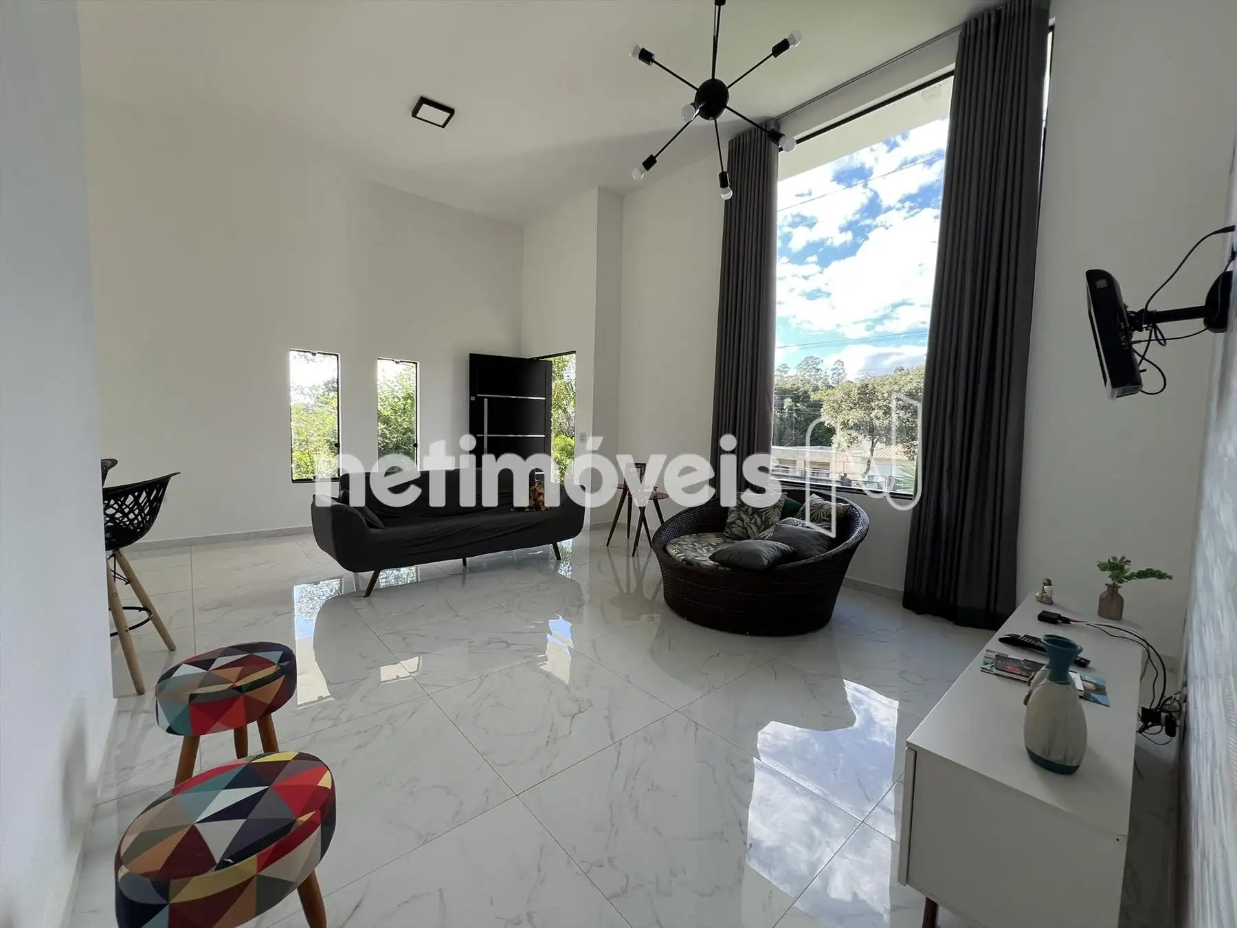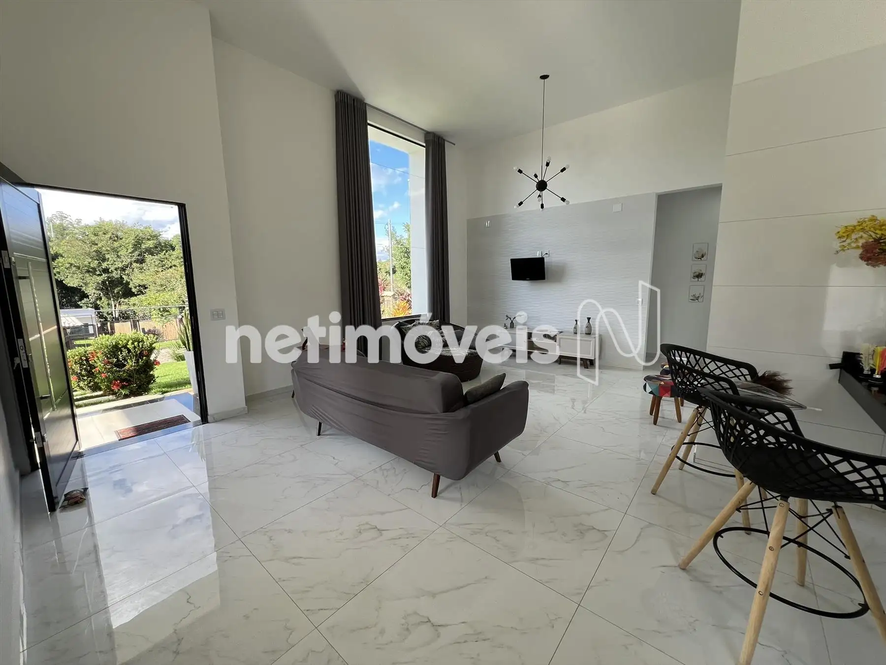 Sala com pé direito duplo, com piso em porcelanato.