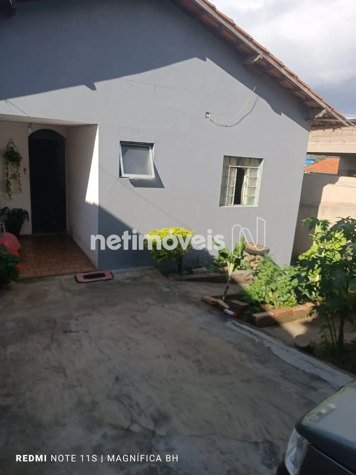 Jardim na frente e garagem coberta para 2 carros, com espaço adicional para veículos grandes.