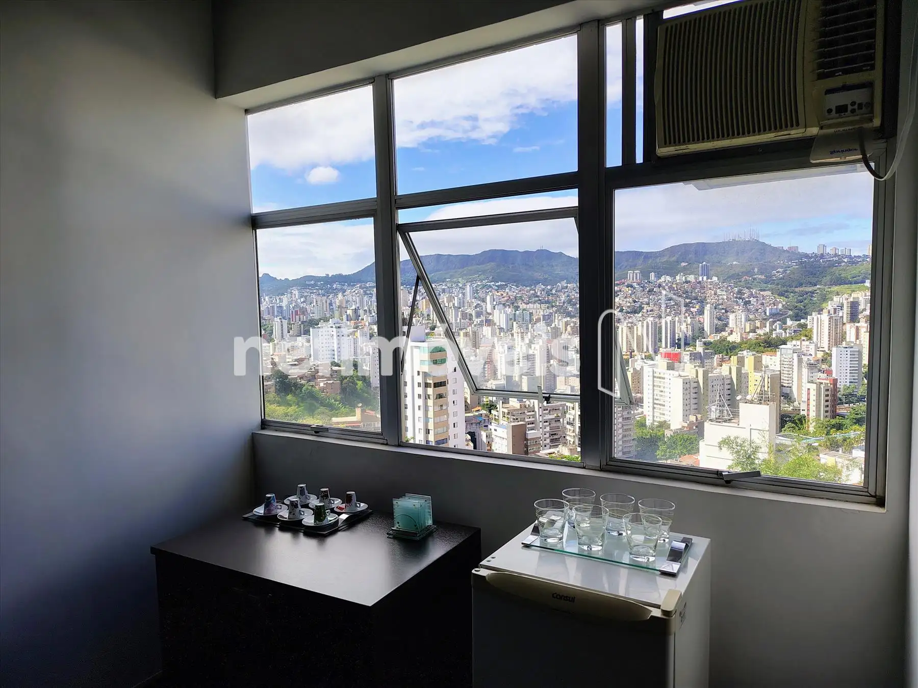 A sala, com piso em carpete, possui uma linda vista definitiva para a Serra do Curral, e será vendida mobiliada e com ar condicionado. Banheiro com piso e paredes em cerâmica.