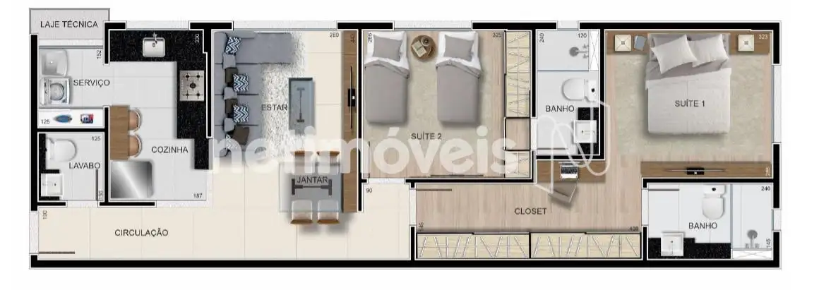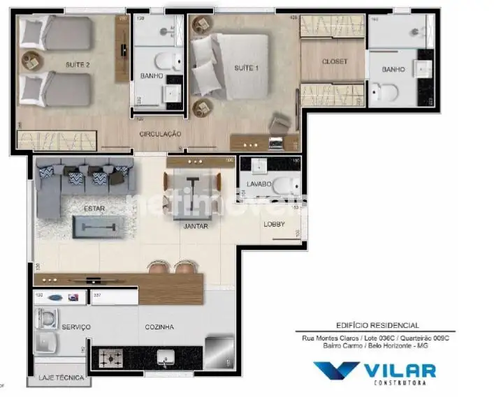 Apartamento à venda no bairro Sion com 68m² bem distribuídos: sala ampla com piso em porcelanato, lavabo, 2 quartos sendo 2 suítes com piso vinílico, cozinha, área de serviço e 2 vagas de garagem.