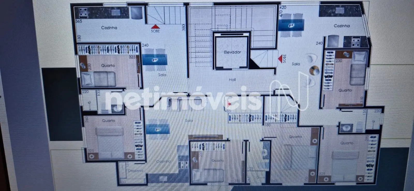 Pisos: Sala, banheiro e cozinha em porcelanato; quartos em laminado padrão madeira.