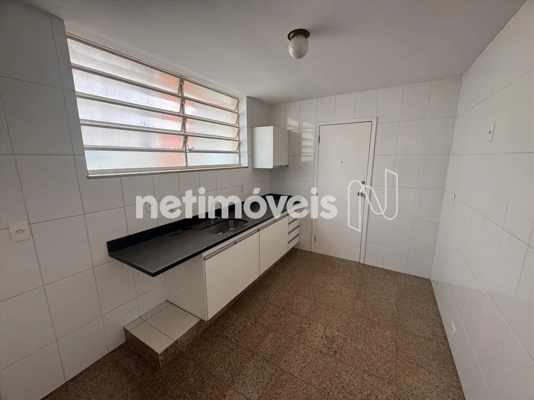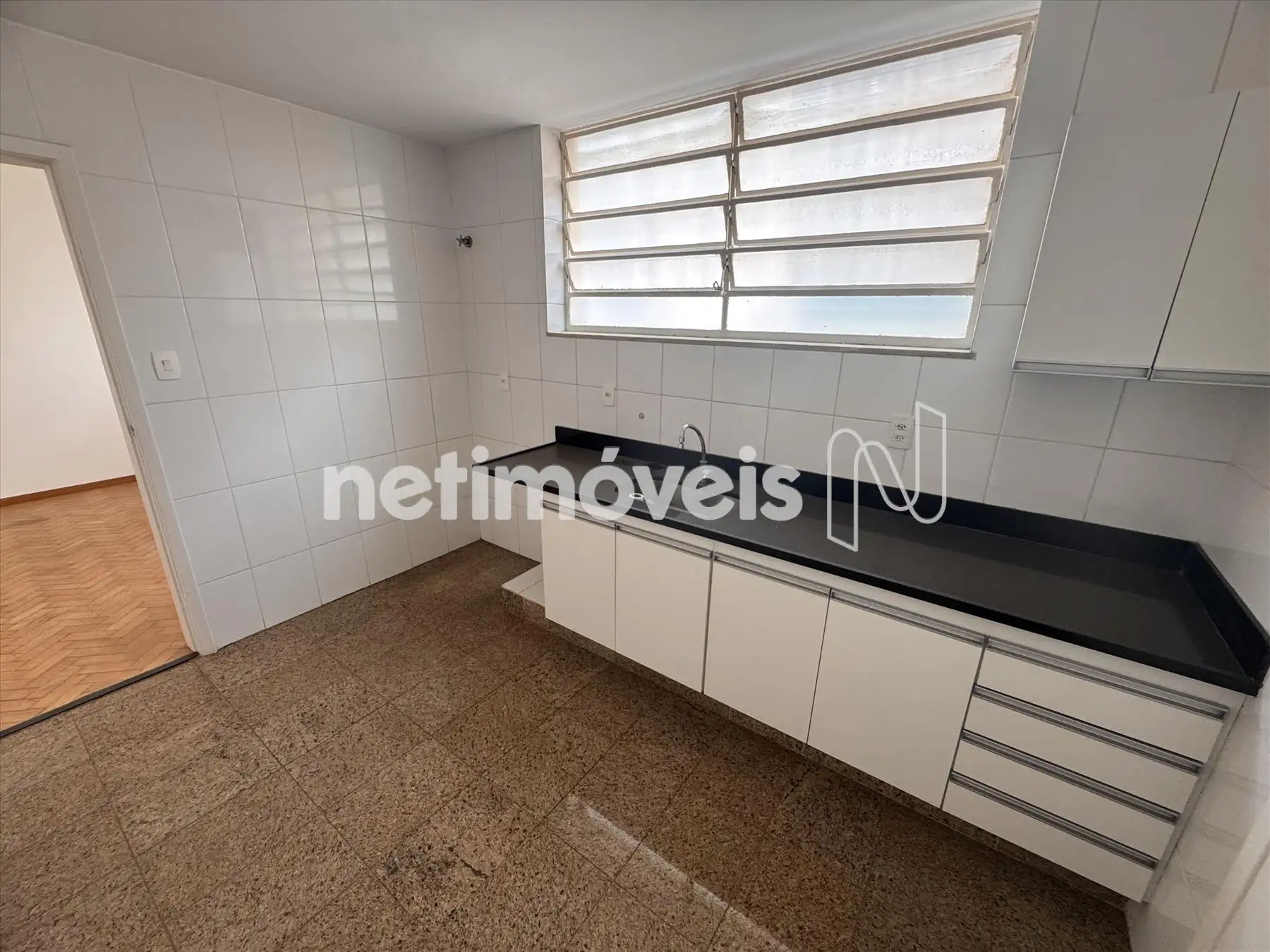 - Cozinha com armários, bancada em granito e piso em porcelanato.