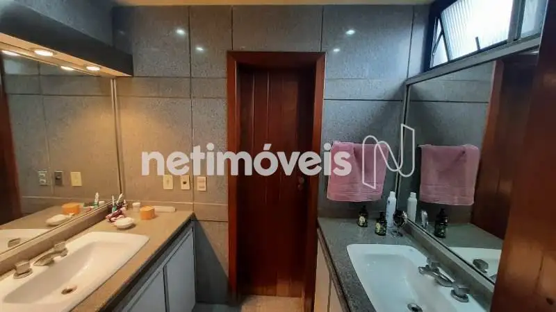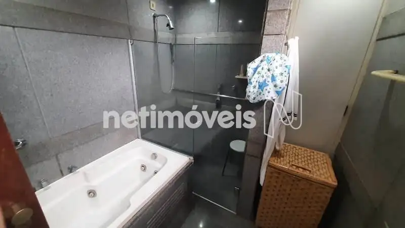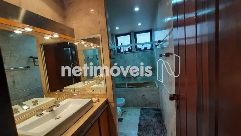 Banheiros com bancadas em mármore Marta Rocha e granito, armários e box em vidro temperado sendo 1 deles com hidro massagem.