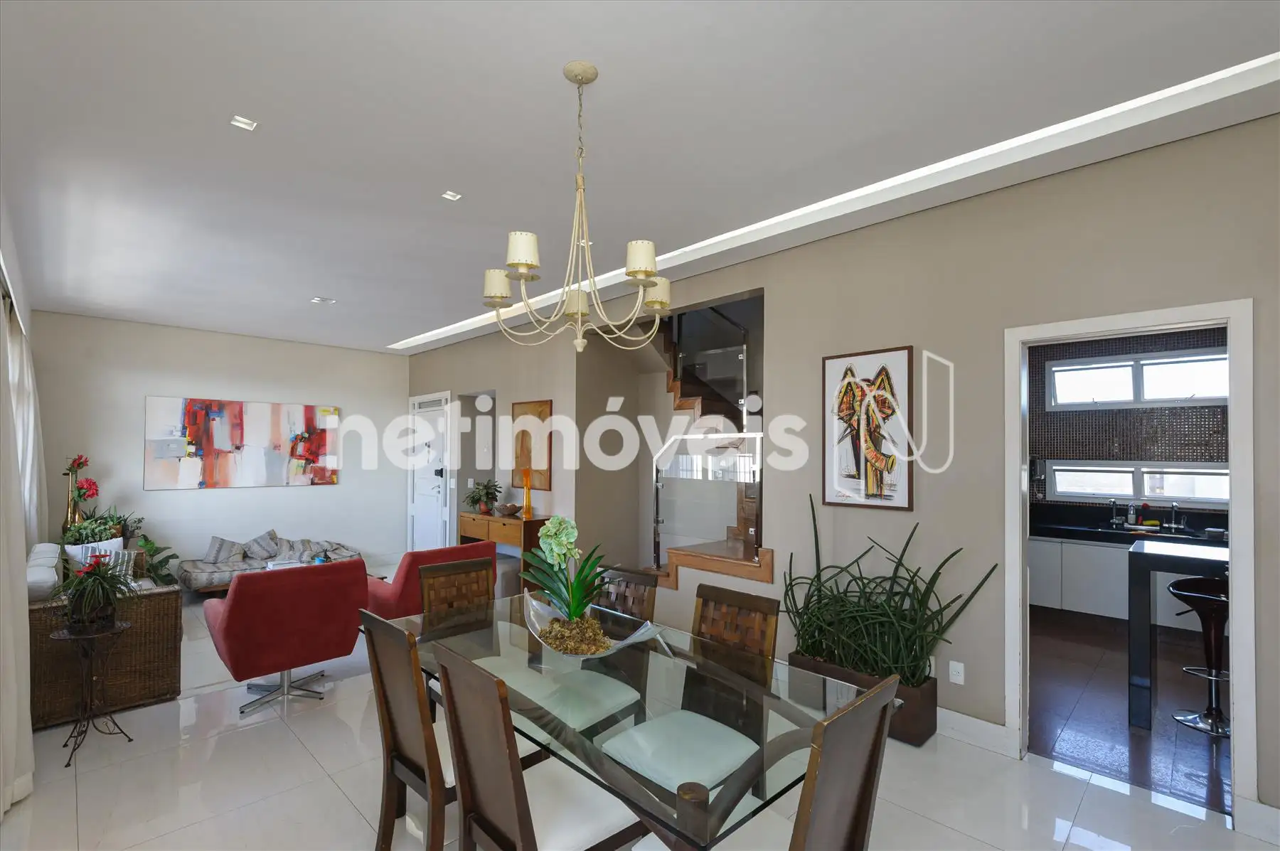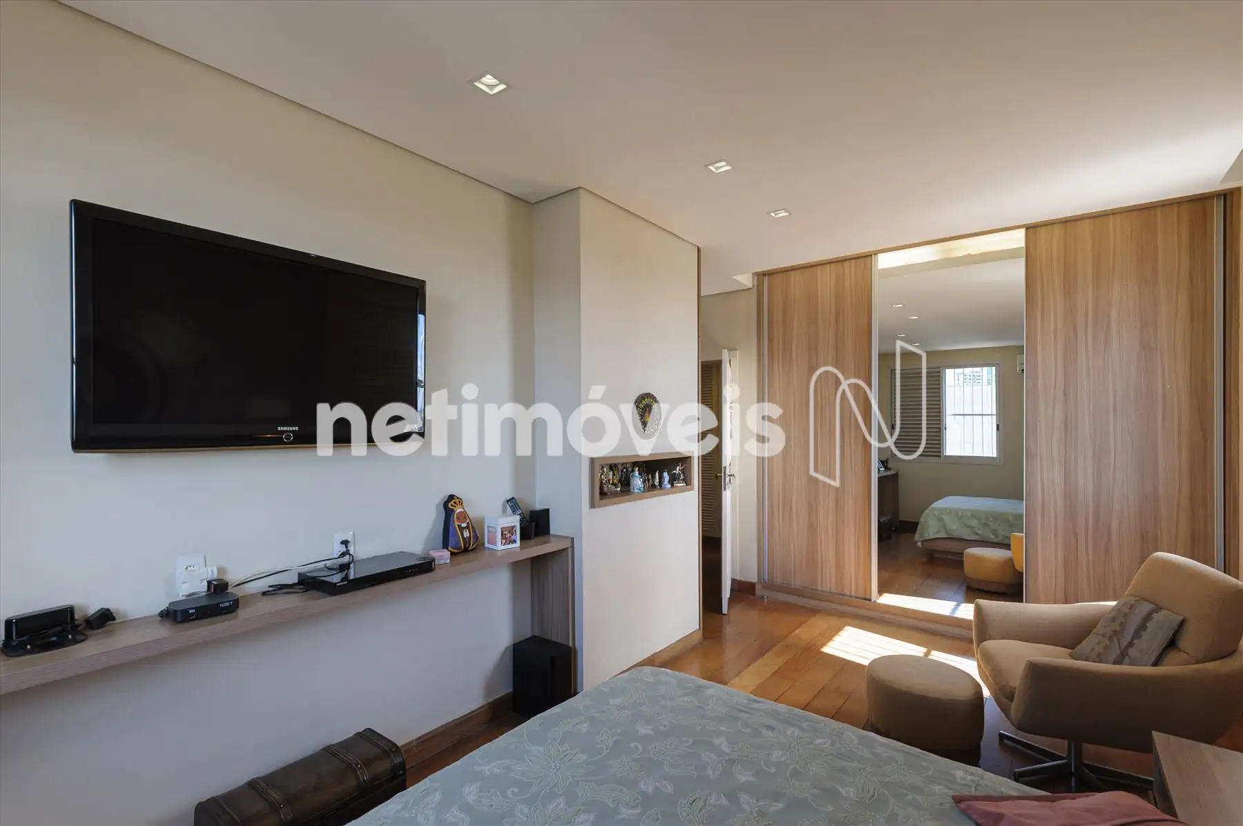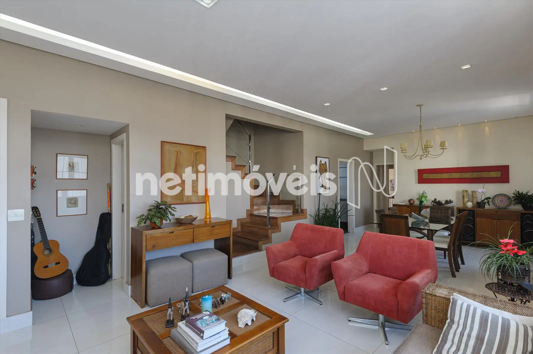 Escada em madeira; Sala ampla com sistema completo de Home Theater, ar condicionado. 1 suite decorada. Cozinha gourmet completa. Sauna, Lavado/vestuário, ducha escocesa, spa.