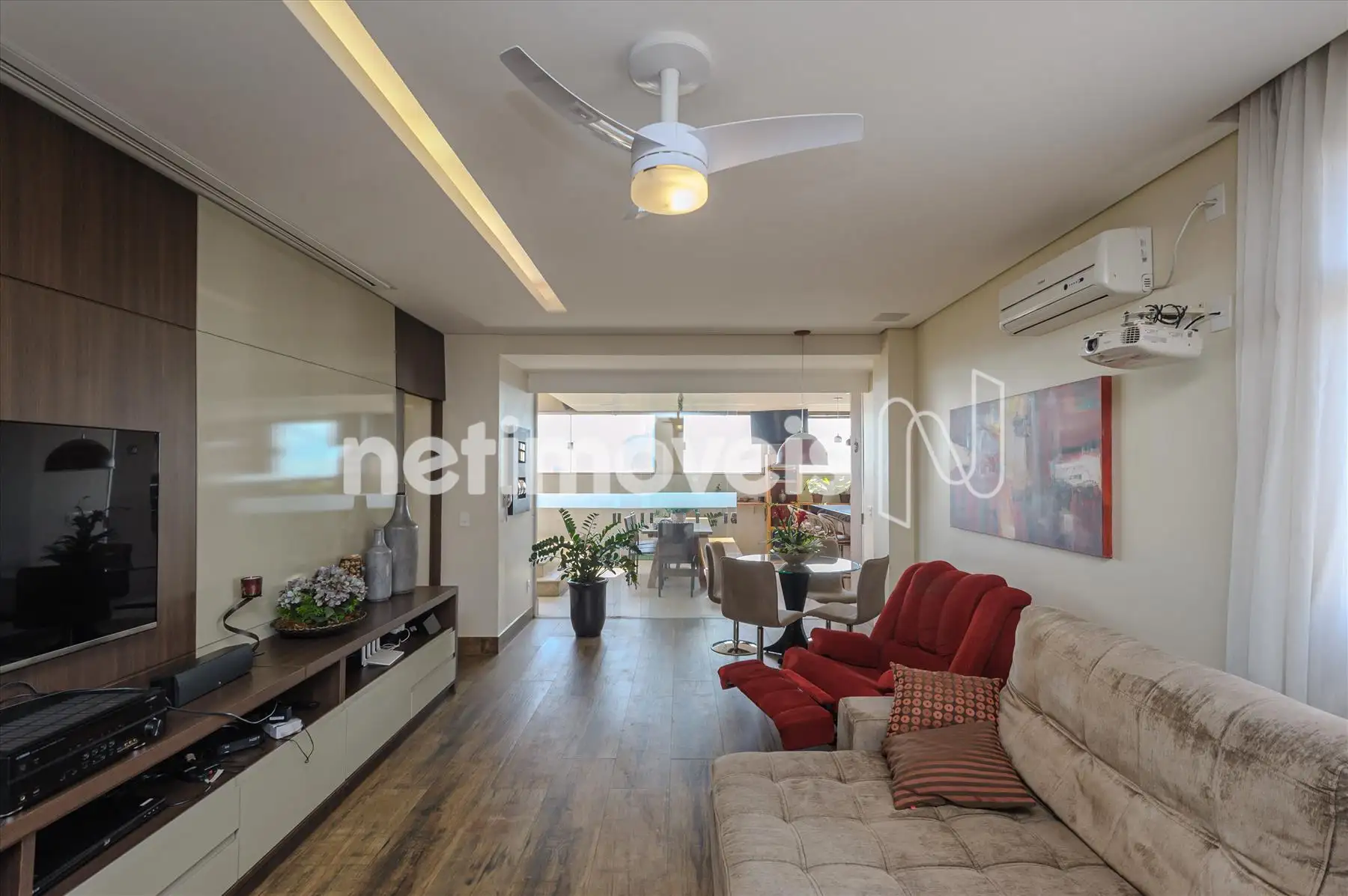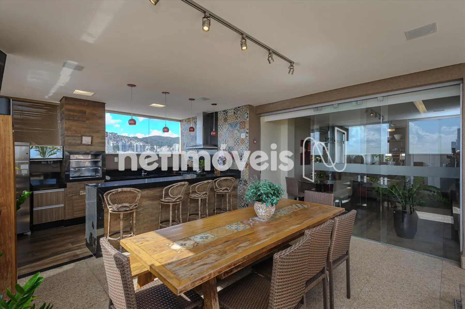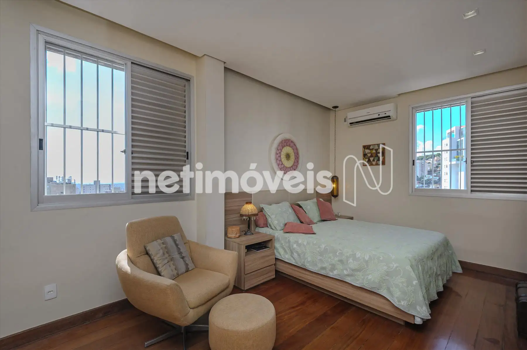 Escada em madeira; Sala ampla com sistema completo de Home Theater, ar condicionado. 1 suite decorada. Cozinha gourmet completa. Sauna, Lavado/vestuário, ducha escocesa, spa.