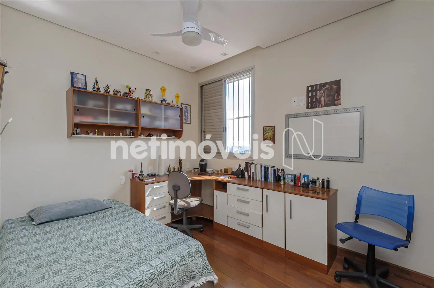 Salão p/ 02 ambientes, piso em porcelanato 60X60, teto em gesso; lavabo; corredor c/ armários; 03 quartos (02 com ar condicionado) c/ armários, piso em tábua corrida; 02 banhos (2 suítes) revestidos em mármore, piso e bancada em granito c/ armários, box blindex; ampla cozinha decorada, piso e bancada em granito c/ armários; área de serviço com bancadas e piso em granito, armários; despensa; dependência completa de empregados c/ armários,