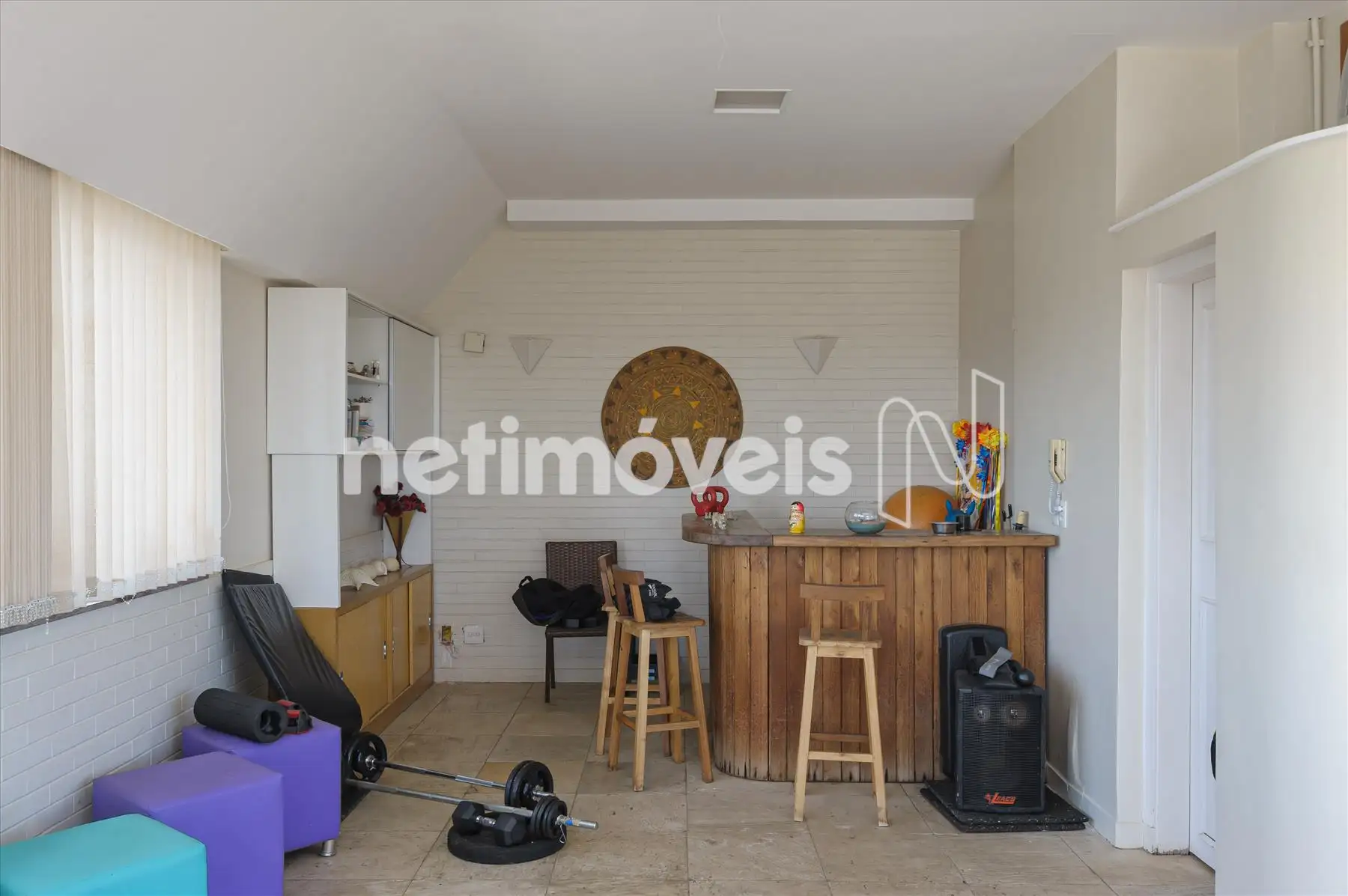 Sala, piso em pedra, banheiro e área livre que circula o andar. Este 3º piso é ideal para academia.