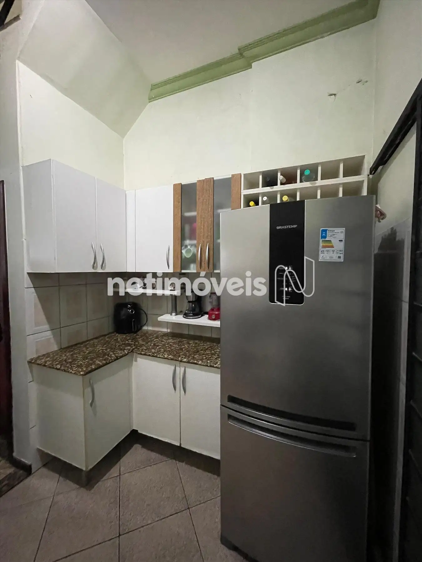 Copa ampla integrada à cozinha, com bancada em granito e armários planejados