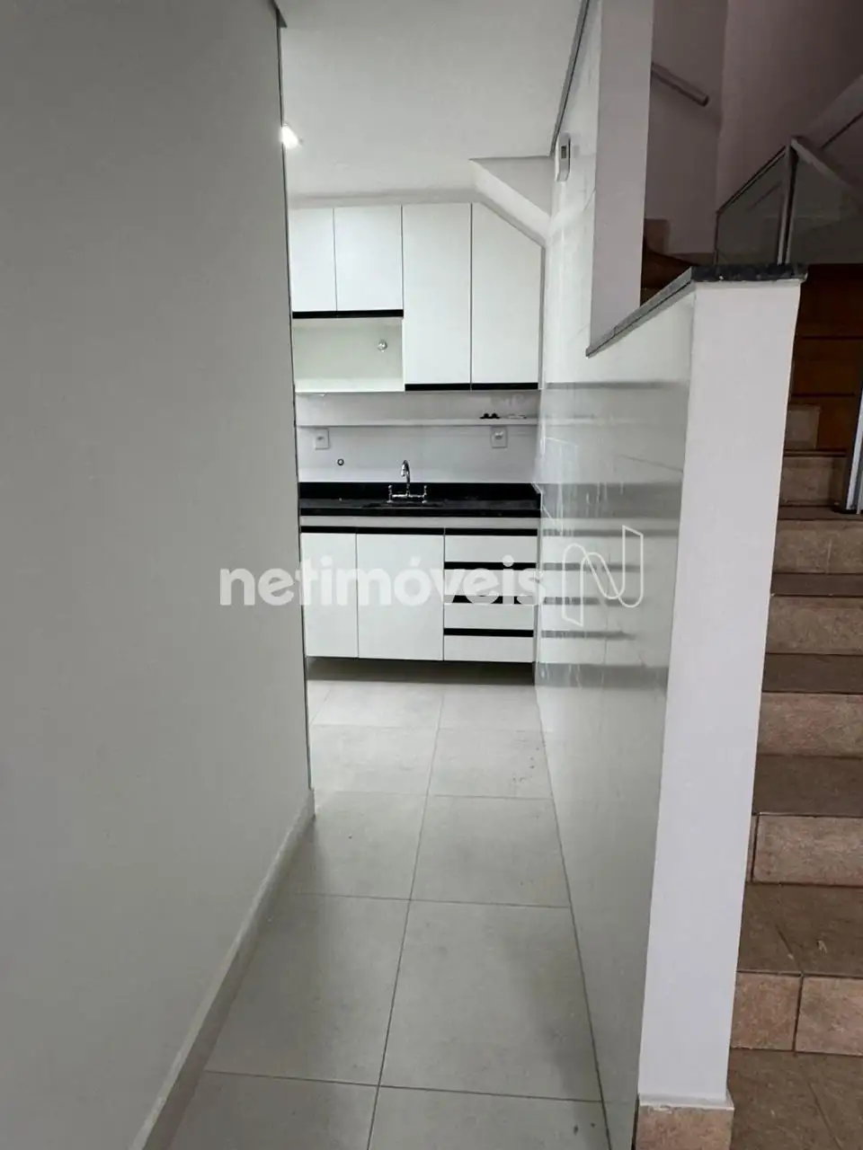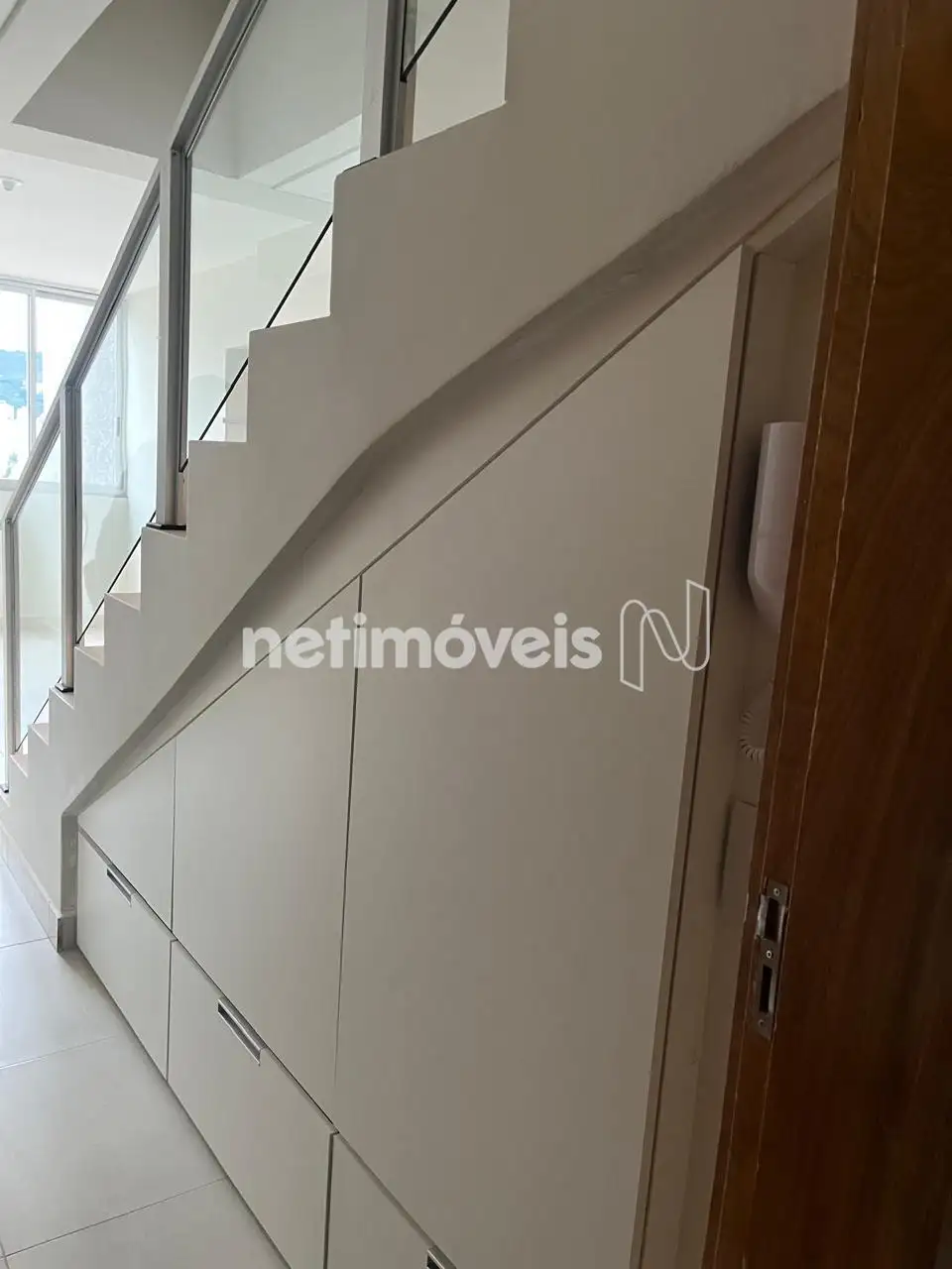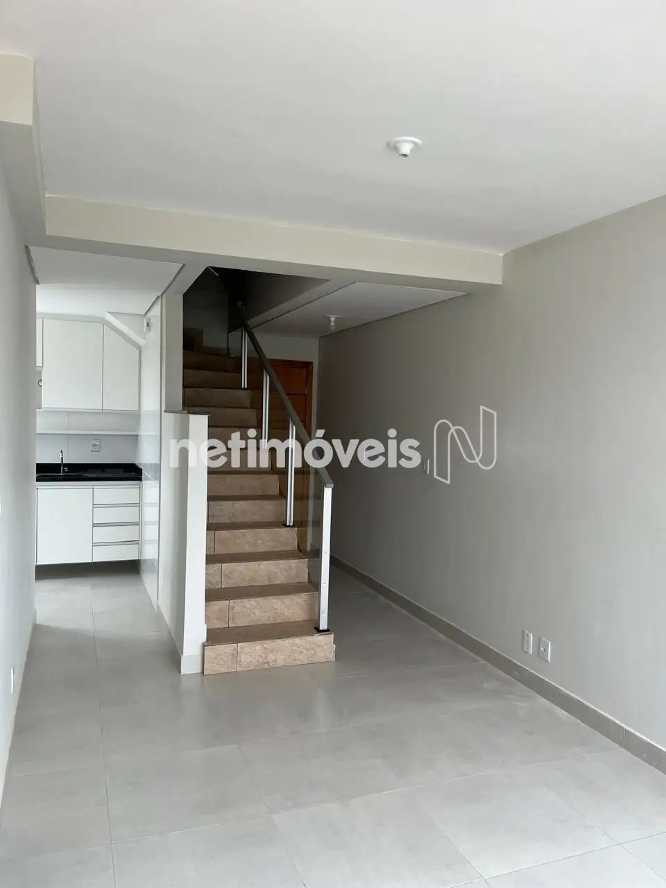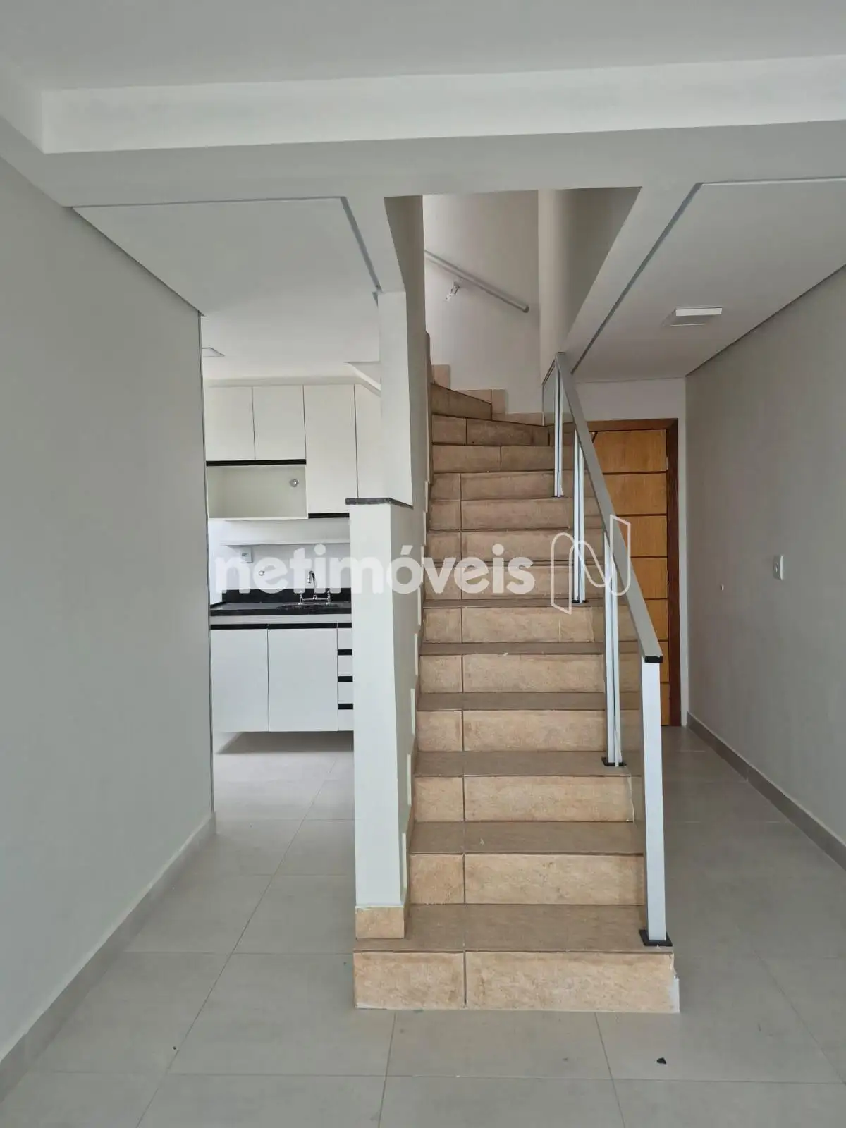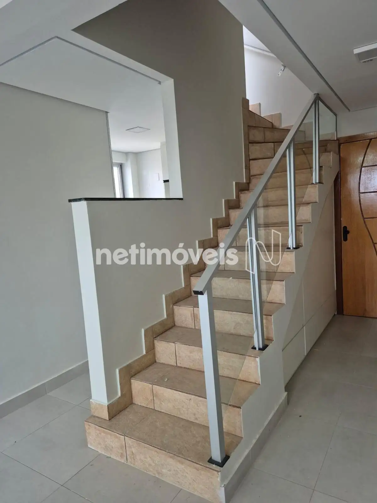 Escada de acesso ao 2° piso em cerâmica, com corrimão em inox e vidro temperado.