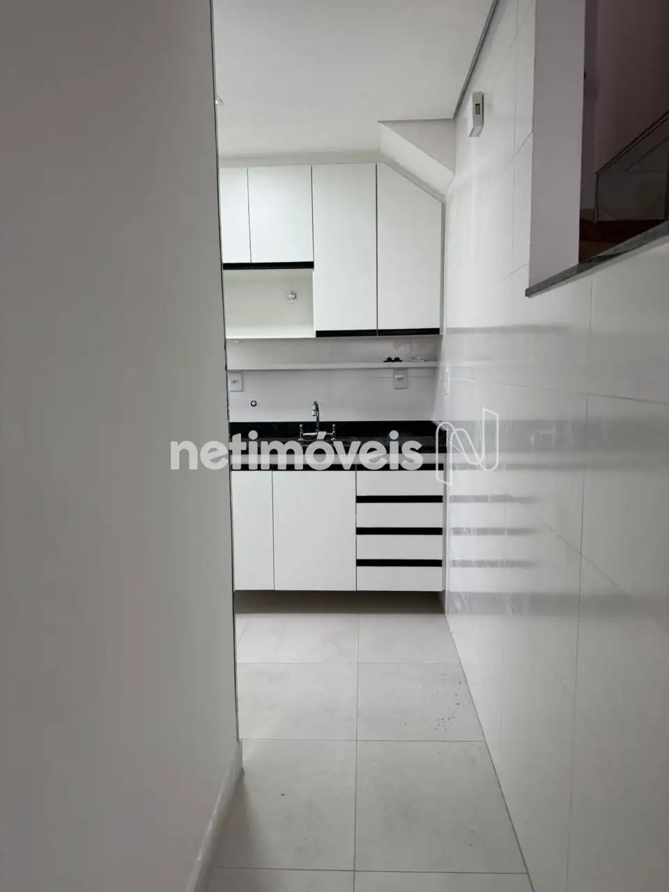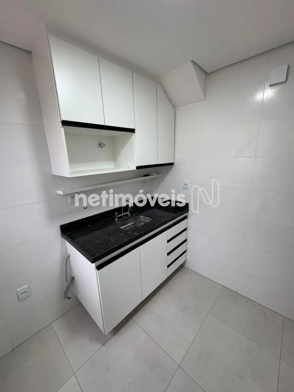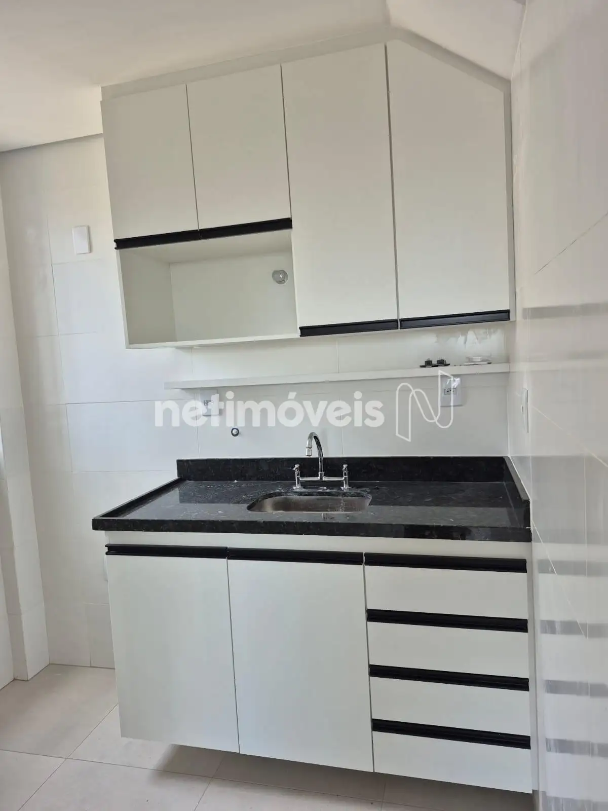 Cozinha com armários, revestimento até o teto, bancadas em granito.