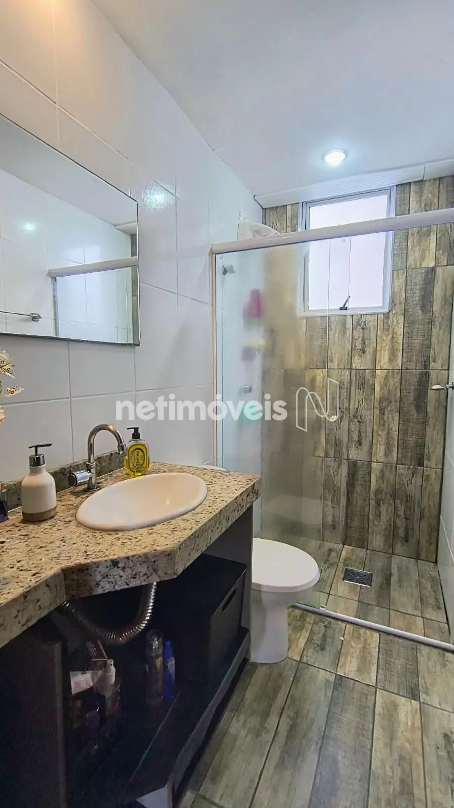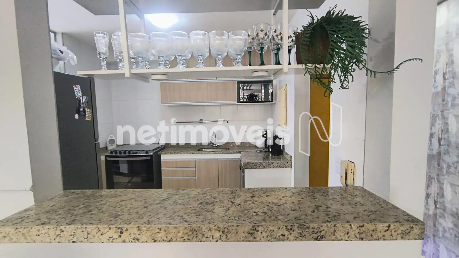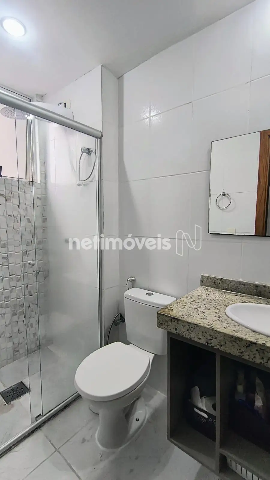 02 banhos (01 suíte), piso em cerâmica na suíte e porcelanato no social, armários sob as bancadas de granito, box com vidro temperado.