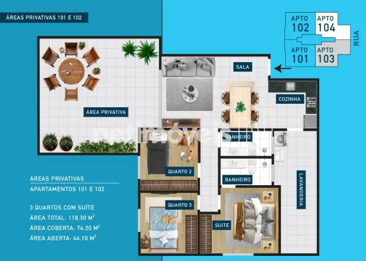 São 74,30 m² de apartamento e 45,00m² de área descoberta:
