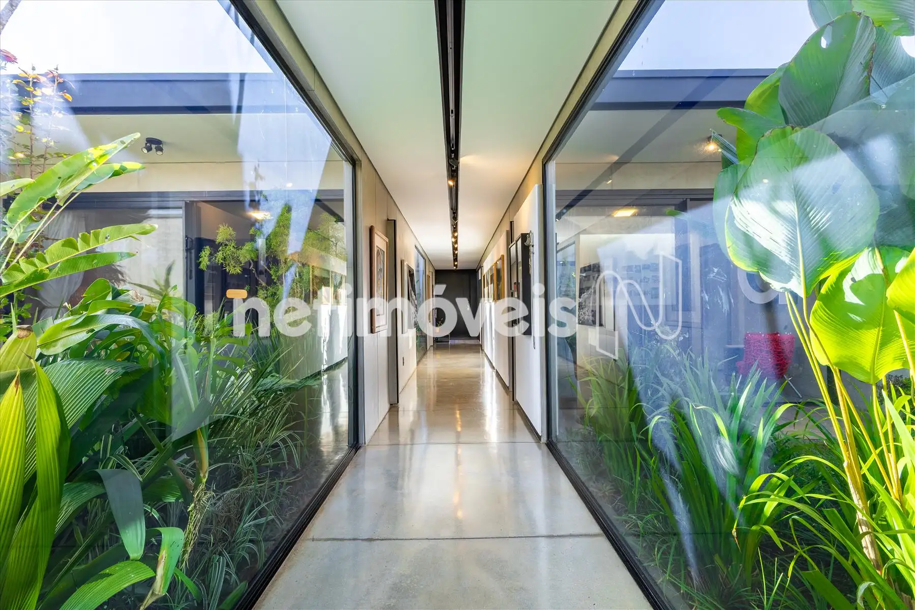 Corredor central de 1,60?m com grandes panos de vidro que conectam o interior da casa ao jardim interno, trazendo o verde como protagonista.