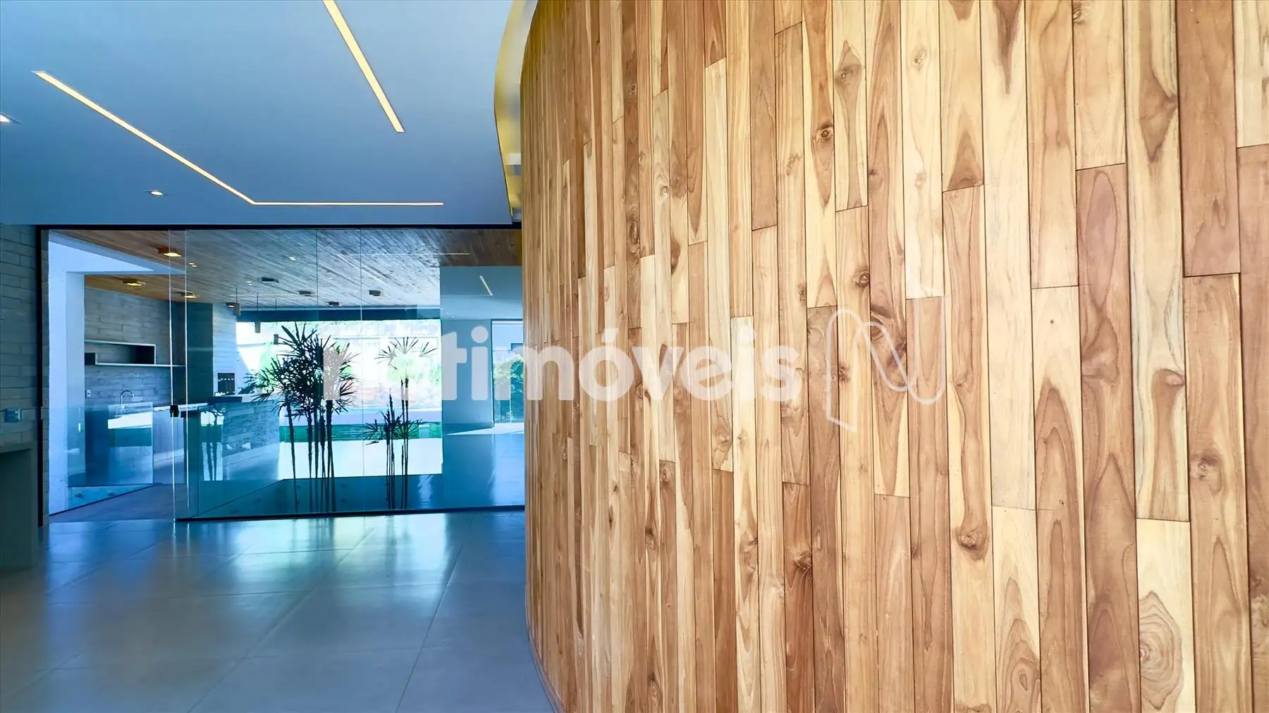 • Sala de jantar com sofisticado painel de madeira curvo