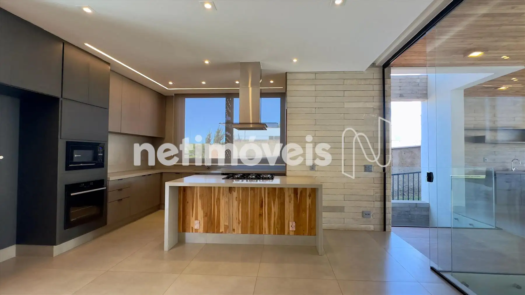 • Cozinha americana planejada, equipada com armários de alto padrão, fogão cooktop, coifa, forno elétrico, micro-ondas e despensa