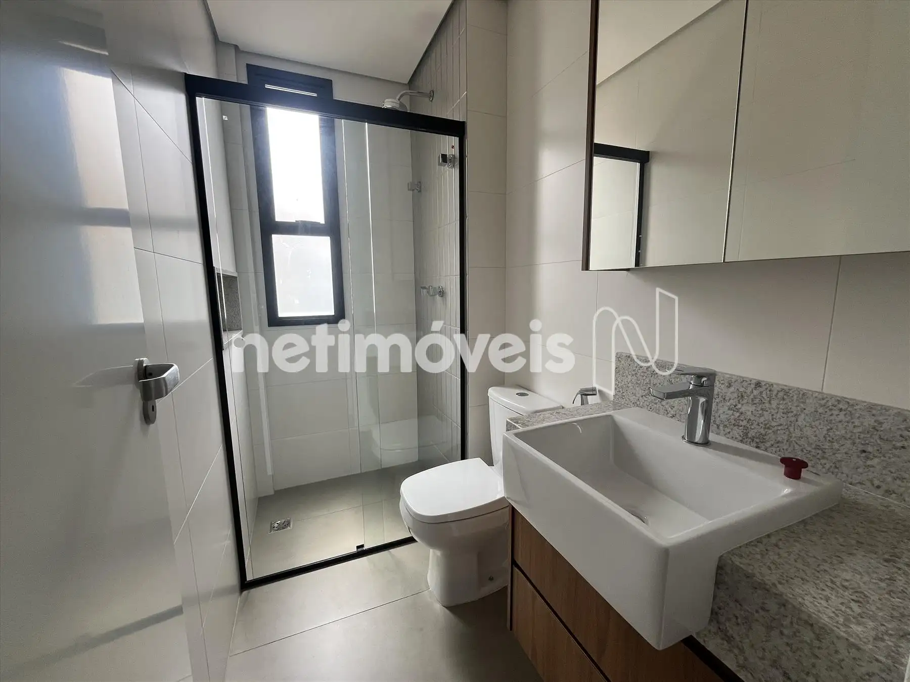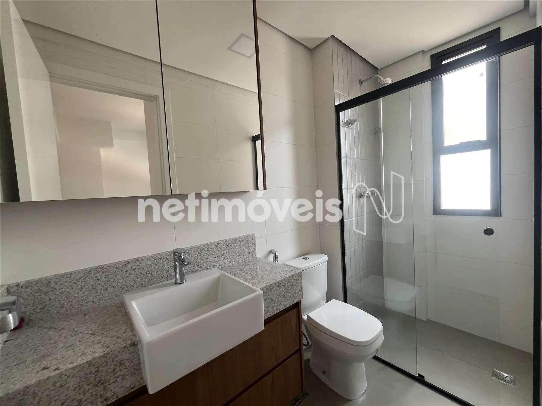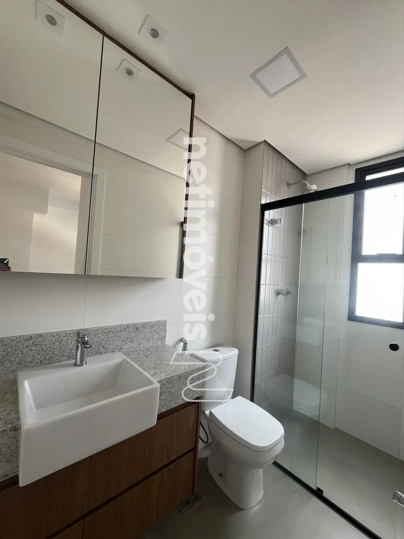 Banheiros das suítes modernos, com bancadas em granito, armários, box blindex e aquecimento solar nos chuveiros; iluminação planejada instalada.