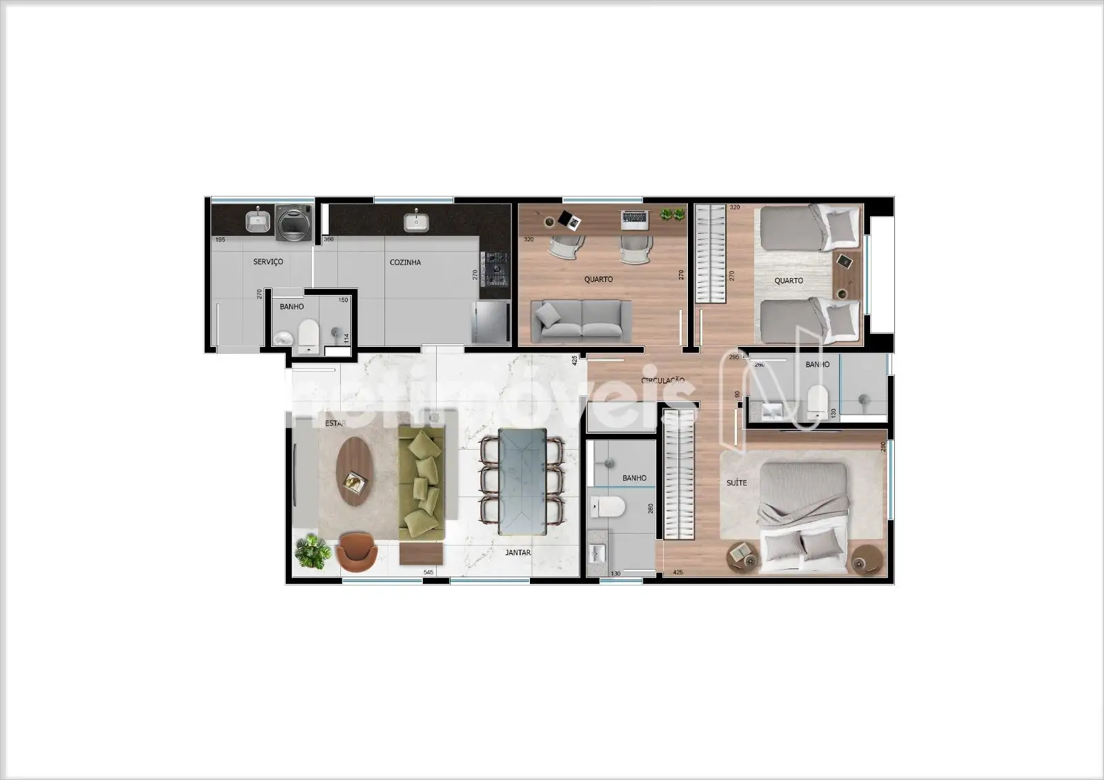 O imóvel apresenta 3 quartos, todos preparados para ar-condicionado, com armários planejados na suíte, no quarto de solteiro, na rouparia e na cozinha. A cozinha é revestida com cerâmica Incepa até o teto, equipada com cooktop e forno a gás. Os banheiros também contam com revestimento Incepa, espelhos, acessórios e louças Roca/Celite.