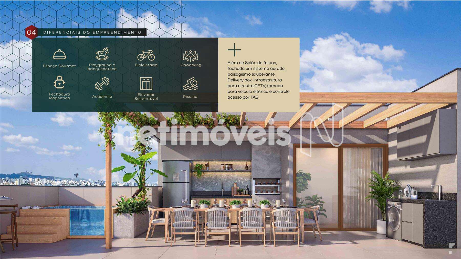 Prédio: Em construção, 07 andares, 04 aptos por andar, pilotis, fachada aerada, interfone, portão eletrônico, hall decorado, salão de festa, piscina, espaço Gourmet, bicicletário, playground, academia, coworking, elevador social, fechadura magnética, C.F.T.V., gás canalizado e água com medidores individualizados e esquadrias de alumínio com venezianas.