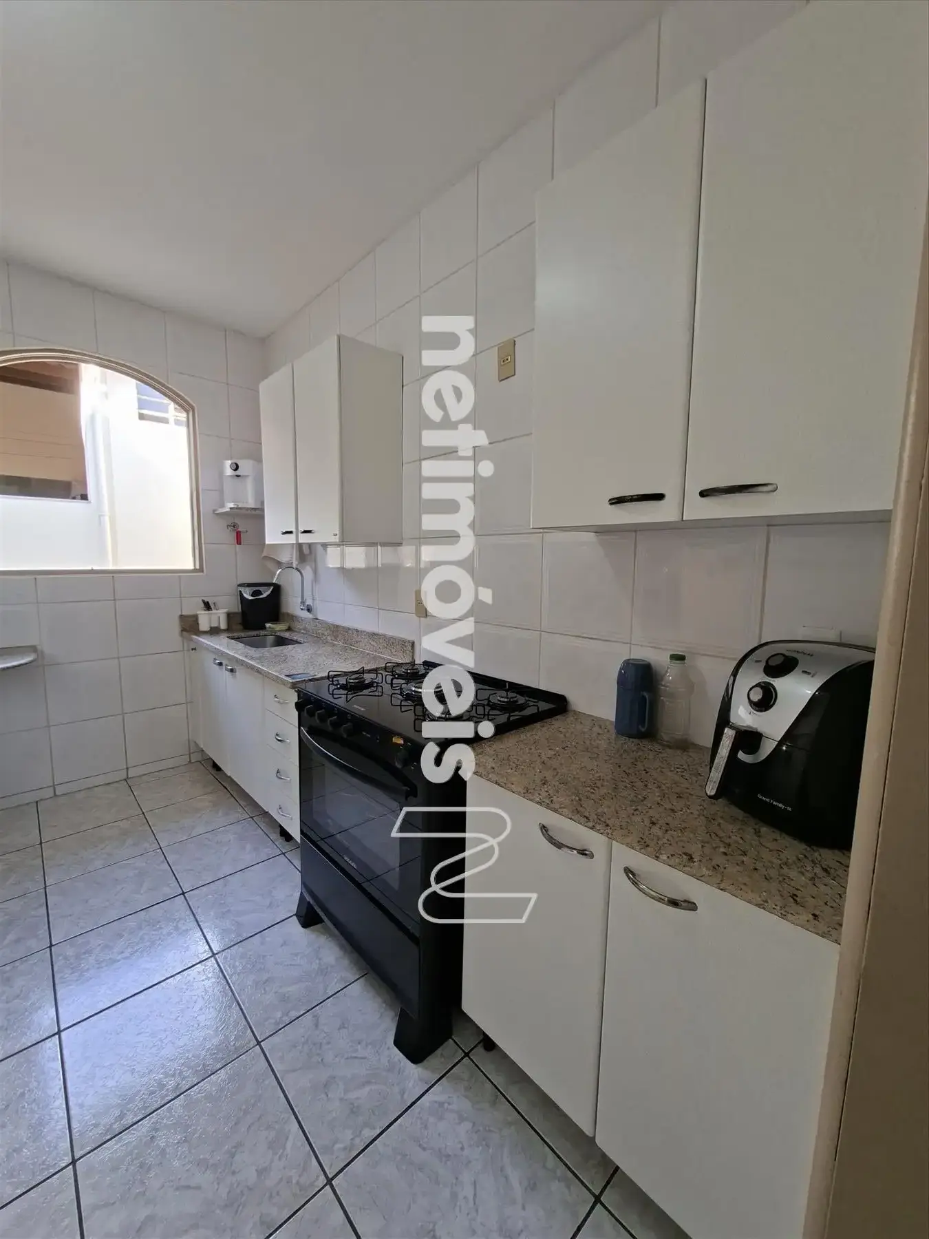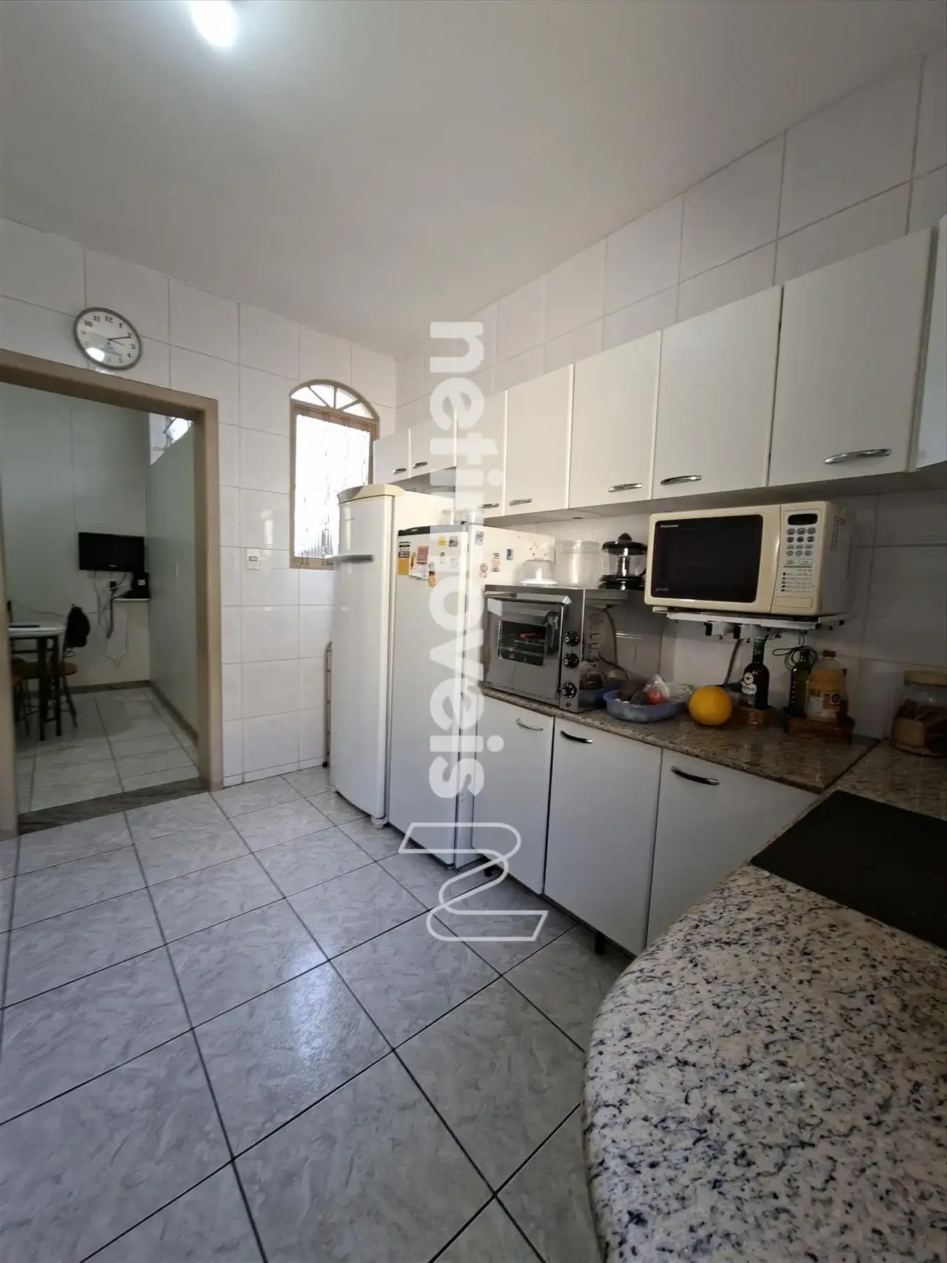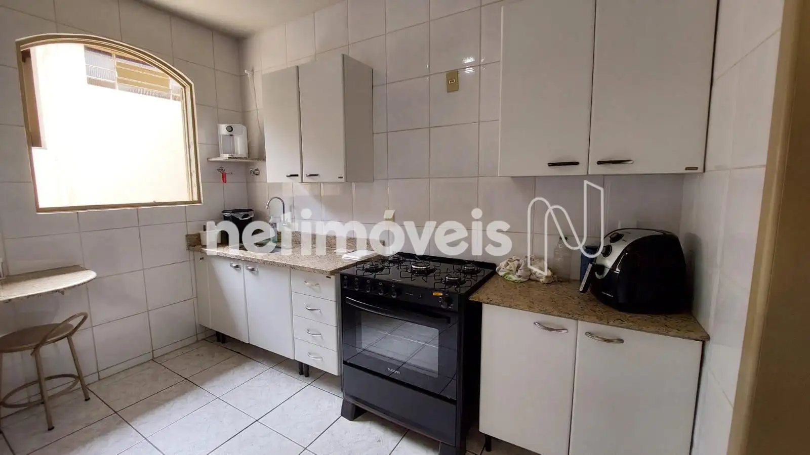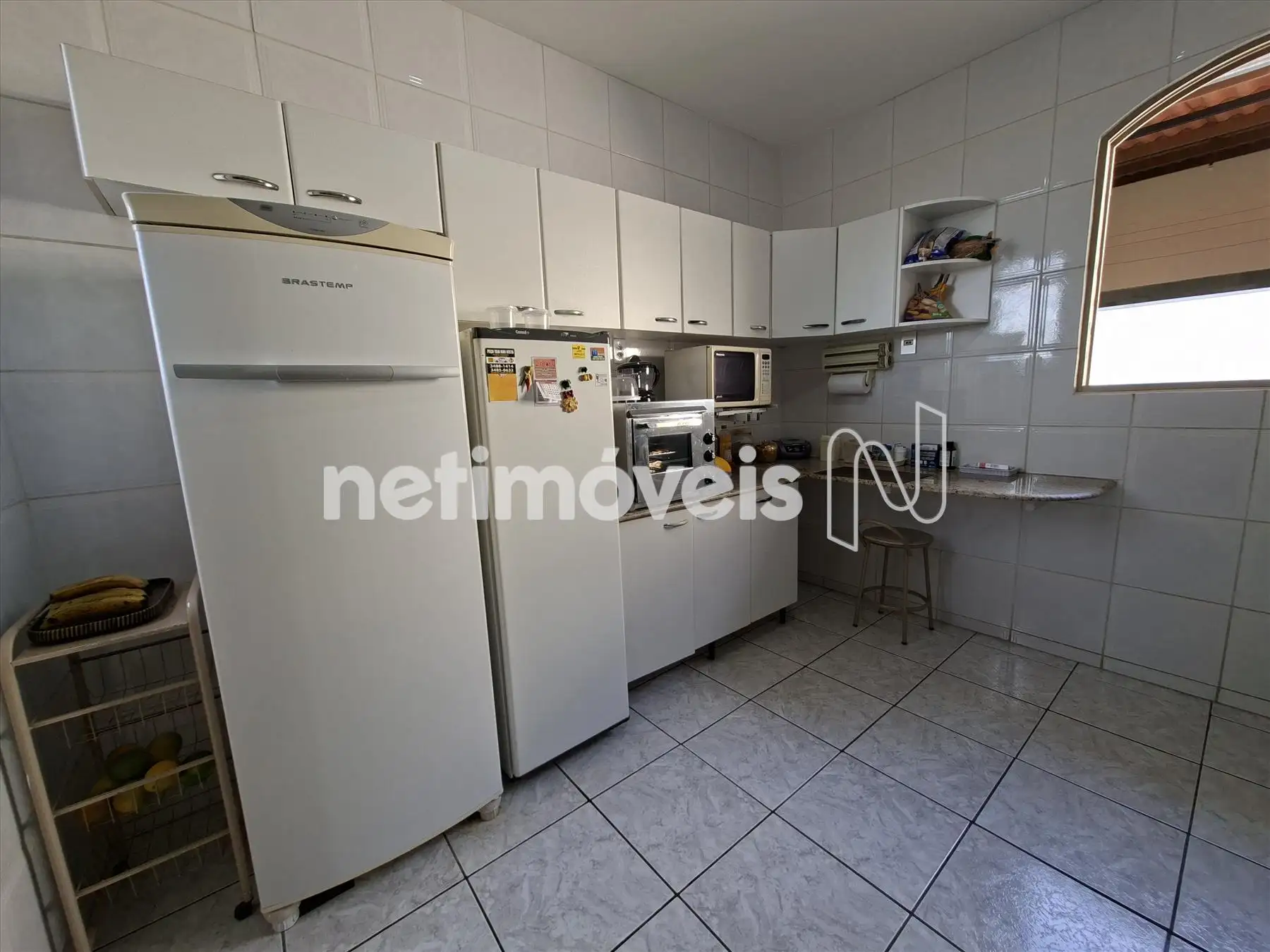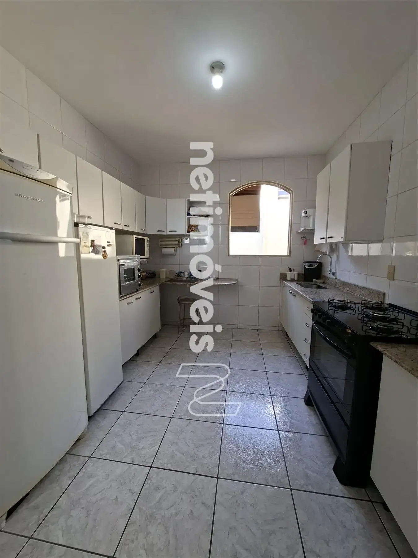 Cozinha ampla, clara, arejada e com armários;