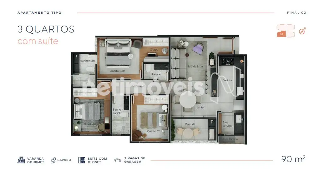 Apto tipo com 90m², 03 quartos (1 suíte), varanda gourmet e também opções de área privativas e coberturas.