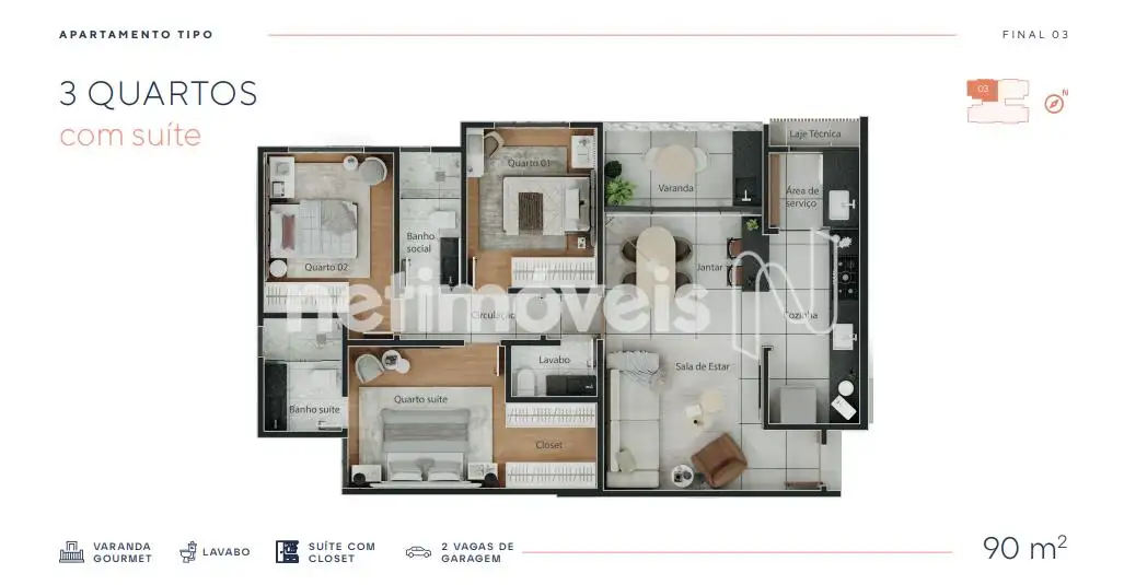 Apto tipo com 90m², 03 quartos (1 suíte), varanda gourmet e também opções de área privativas e coberturas.