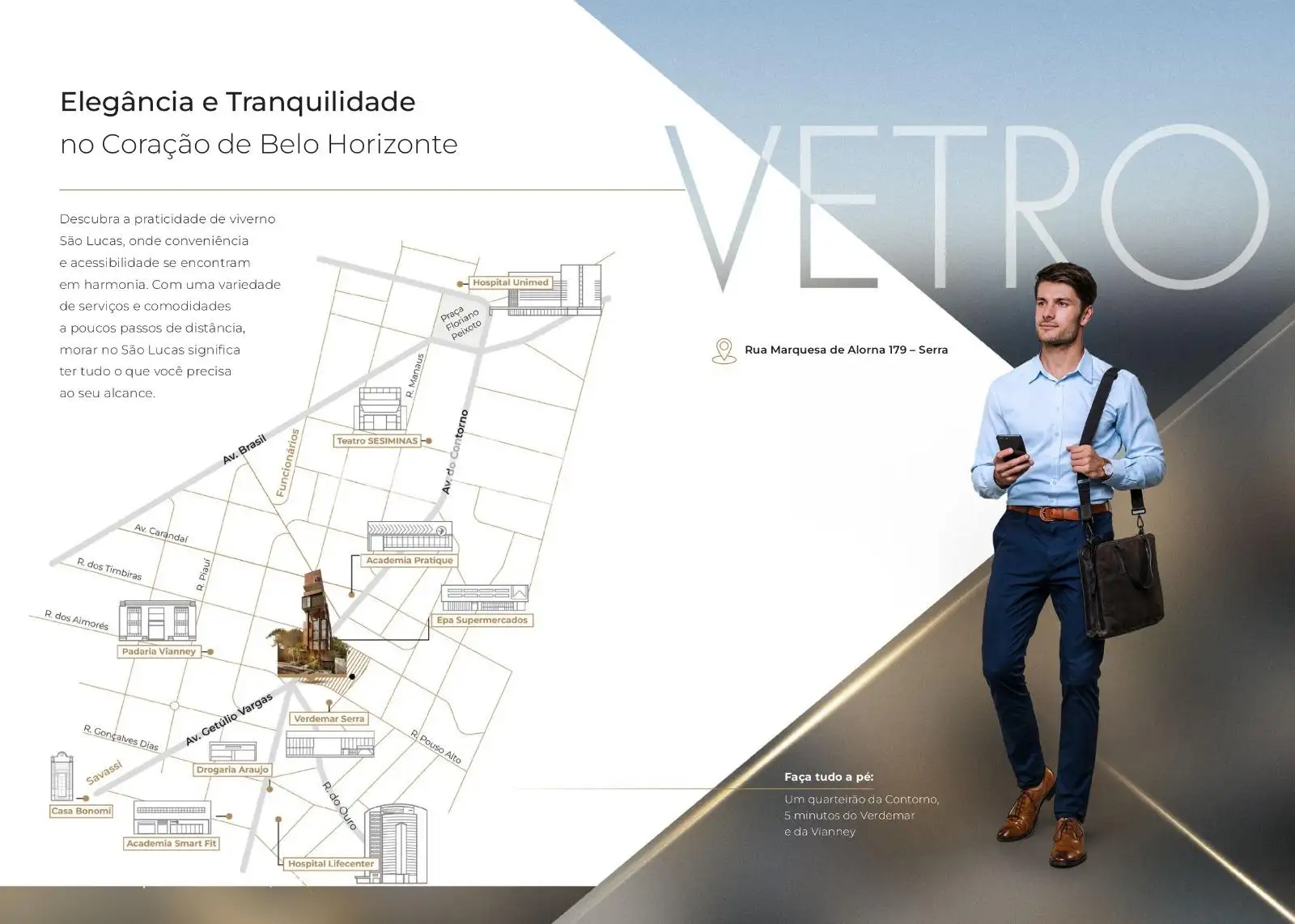 Localizado no charmoso bairro São Lucas a um quarteirão da Av. do Contorno, próximo ao Verdemar da Rua do Ouro. VETRO o mais novo empreendimento de alto luxo da RL Costa, oferece o equilíbrio perfeito entre a tranquilidade, conveniência, praticidade e acessibilidade. O Vetro possui imponente fachada de vidro que reflete modernidade e elegância, oferecendo conforto e privacidade em um ambiente arborizado e silencioso.