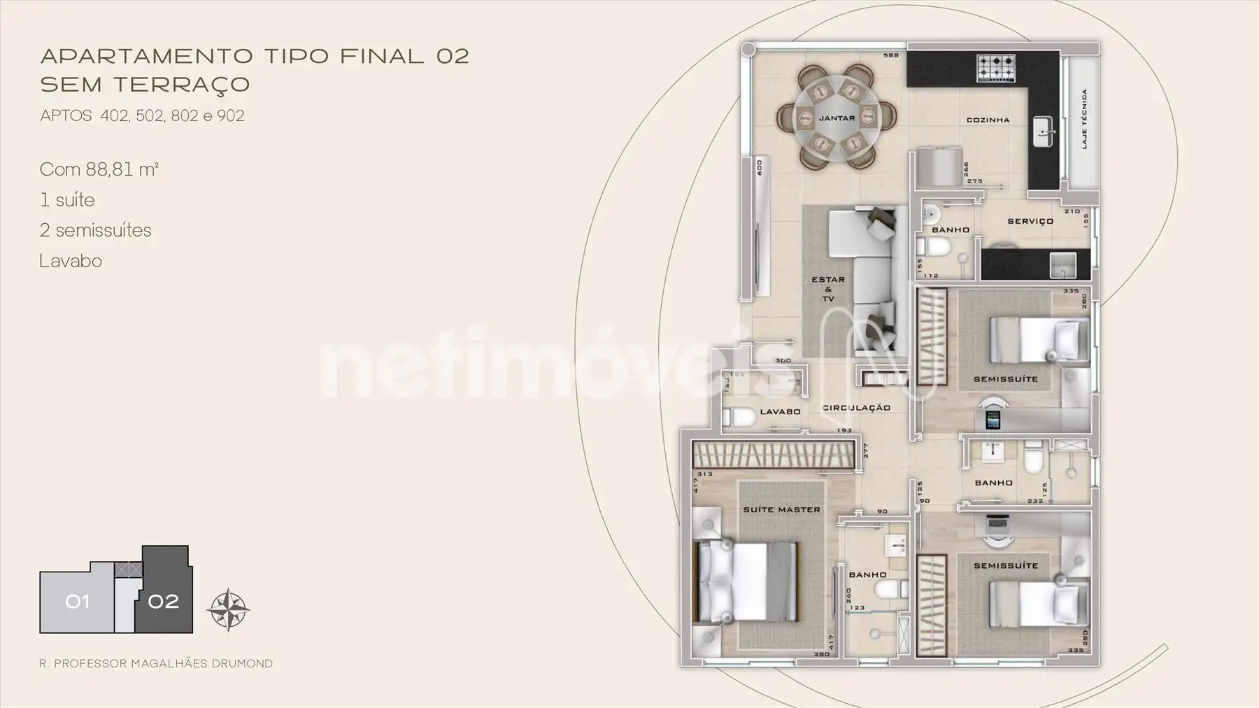 - 2 banheiros sendo 1 suite e 2 semissuites