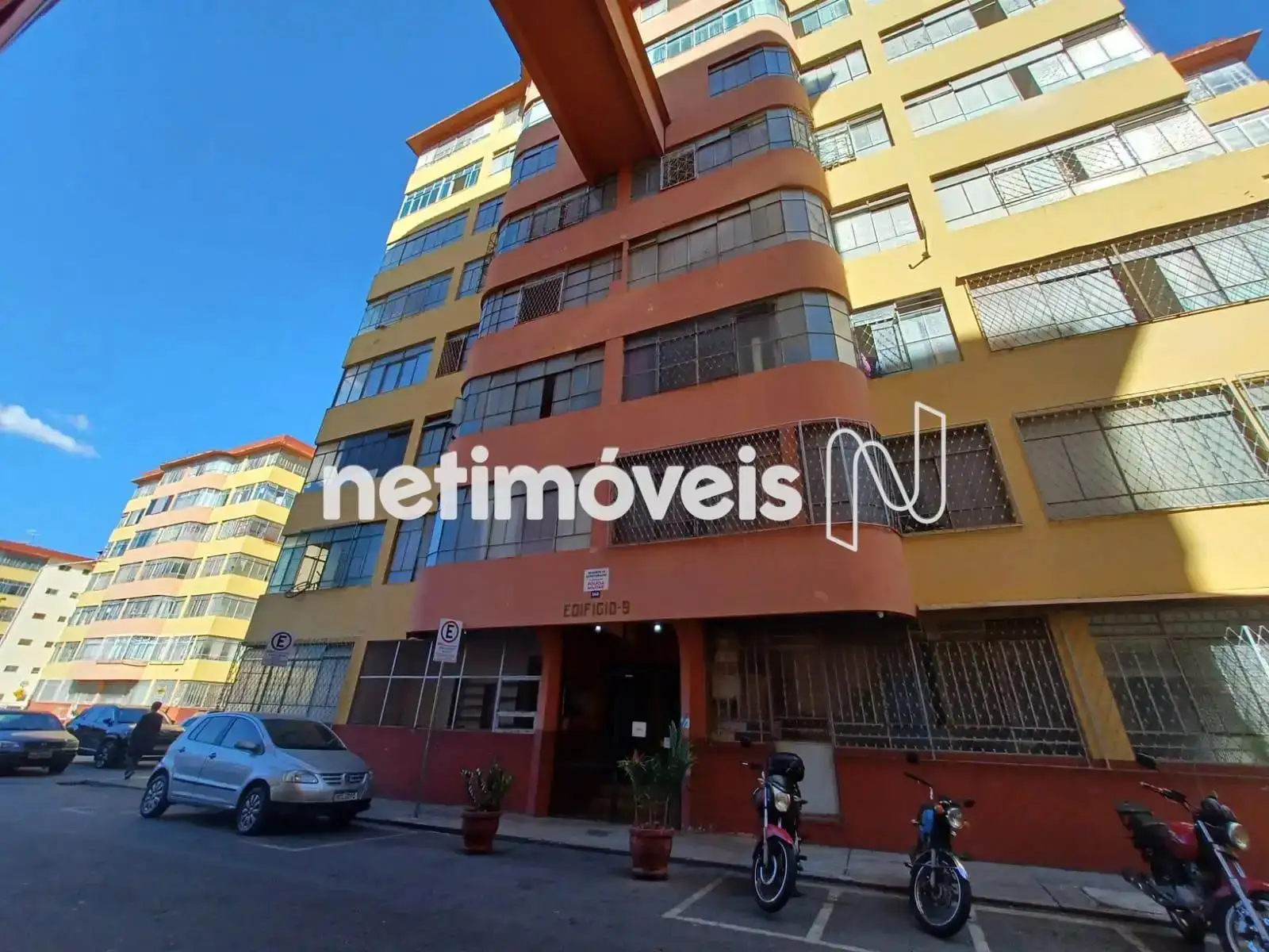 8 Pavimentos, 16 apartamentos, fachada textura, interfone, portão eletrônico, vasto estacionamento descoberto sem demarcação de vaga.
