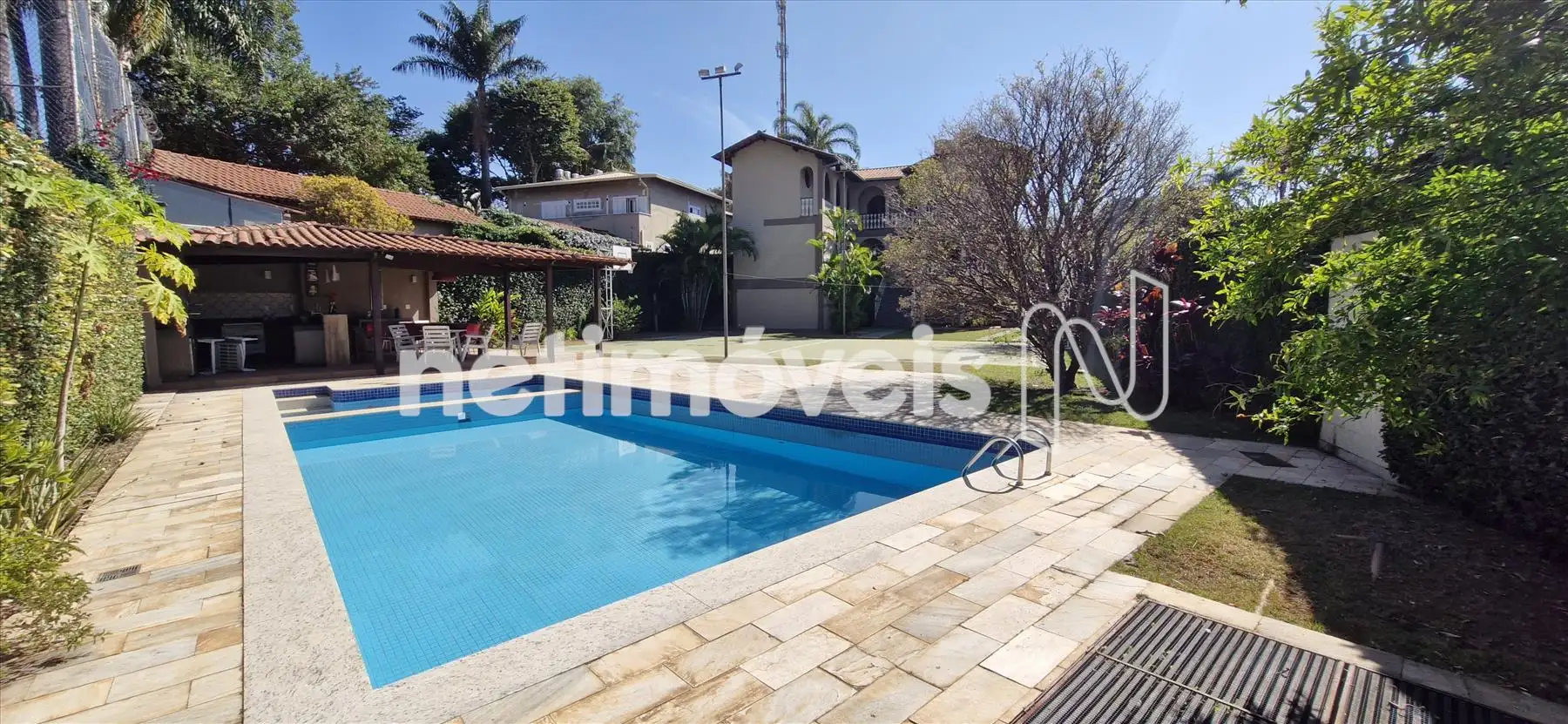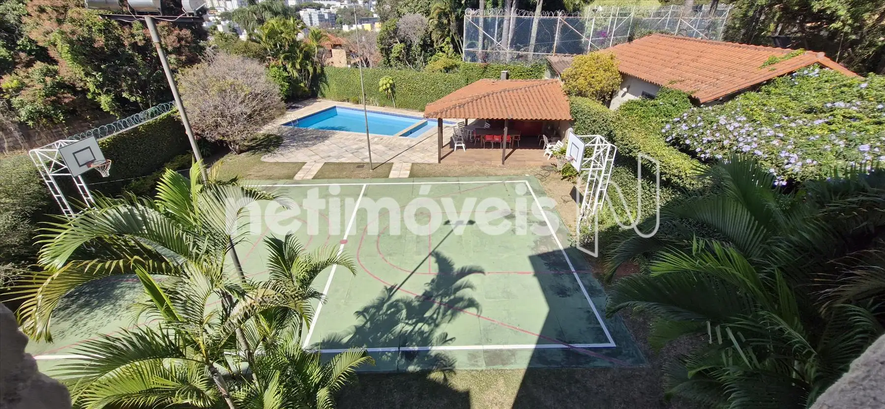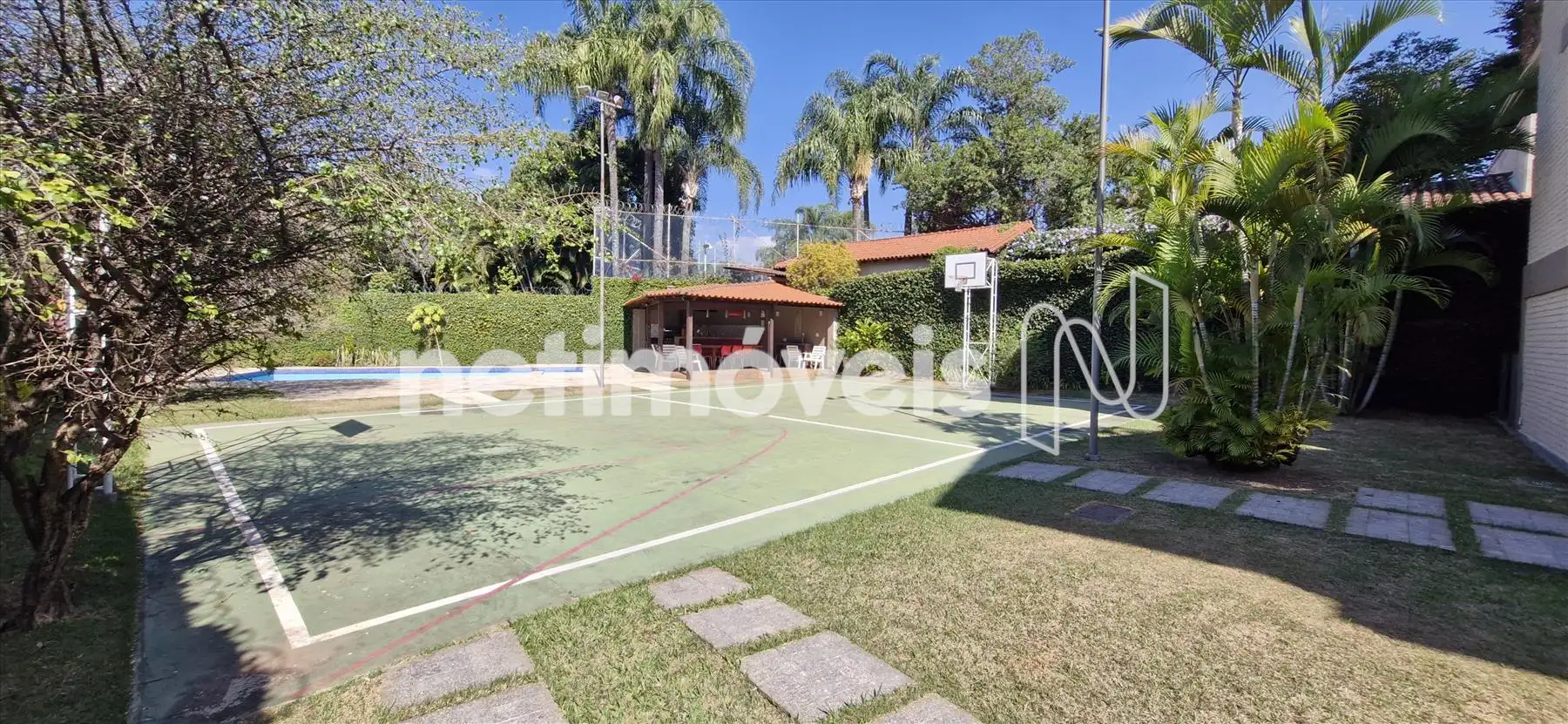 No térreo temos sala aberta e coberta, com 01 vestiário e 2 banheiros, área livre com espaço gourmet, quadra de esportes, piscina e algumas árvores frutíferas.