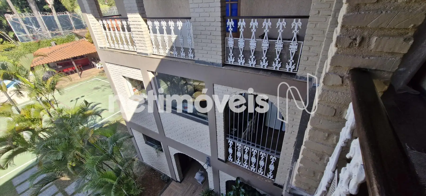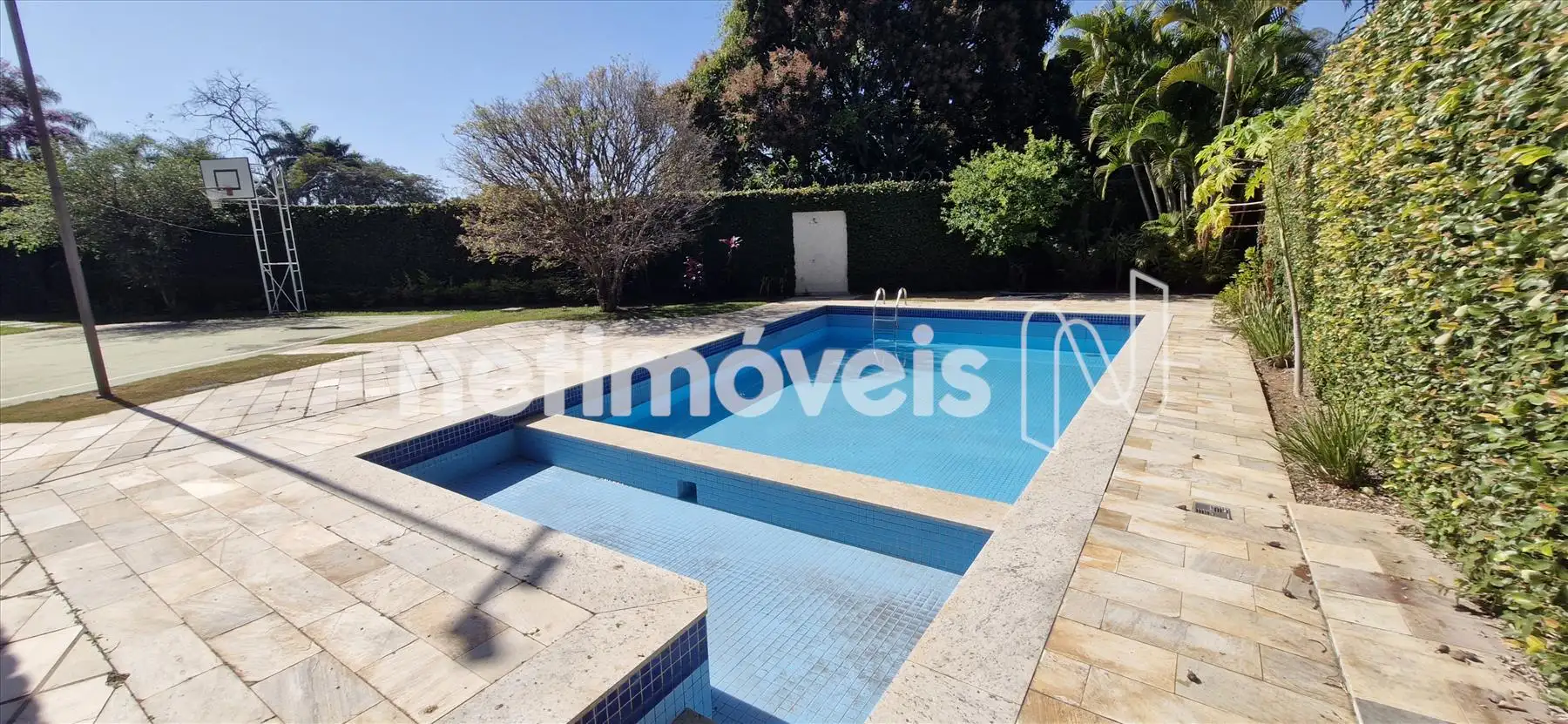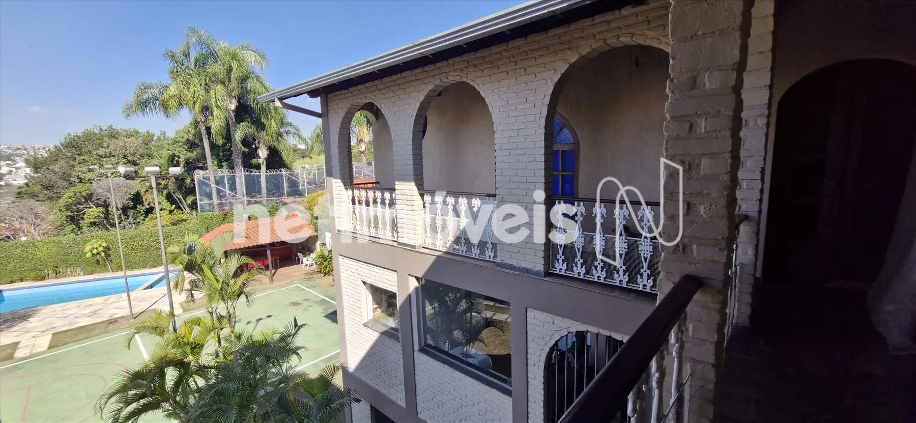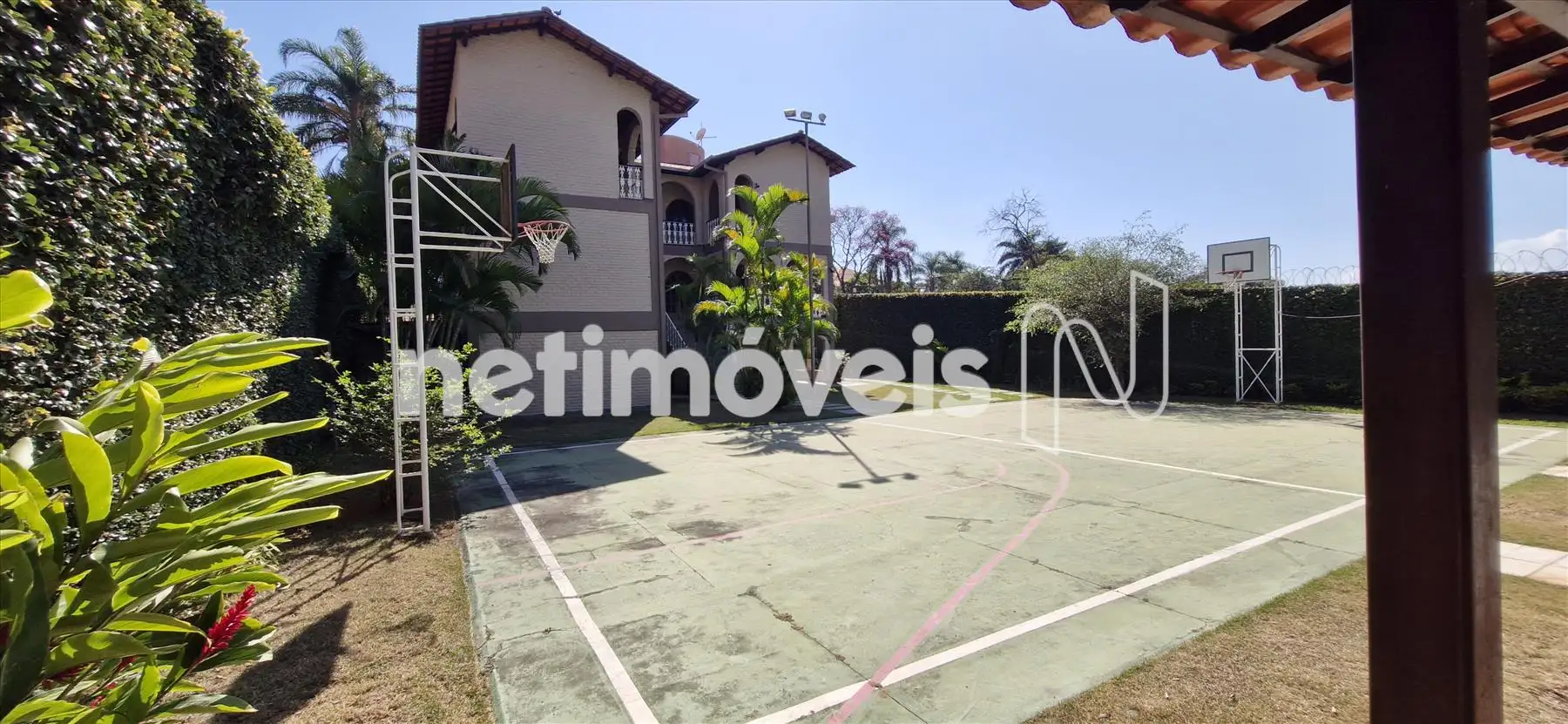No térreo temos sala aberta e coberta, com 01 vestiário e 2 banheiros, área livre com espaço gourmet, quadra de esportes, piscina e algumas árvores frutíferas.