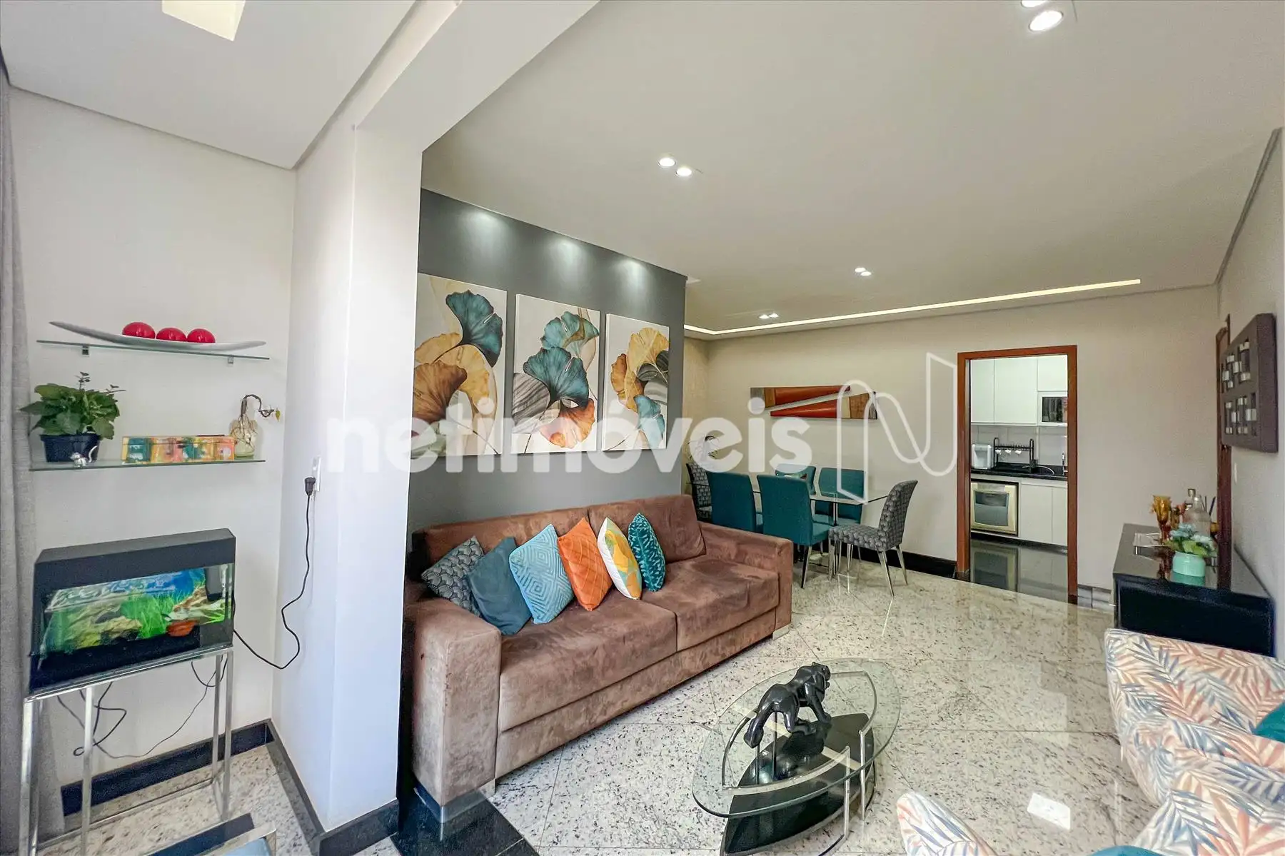 A sala para dois ambientes, com piso em granito, impressiona pelo espaço, elegância e integração.
