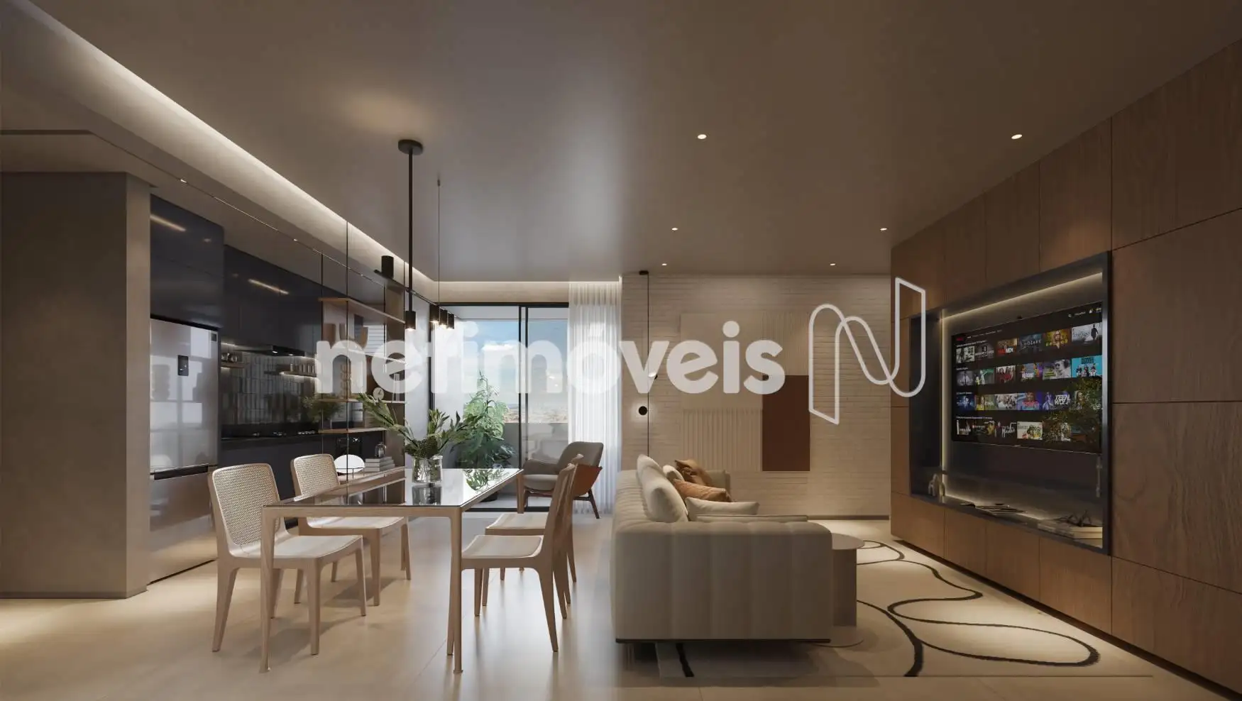 Sala para dois ambientes, dois quartos sendo um suíte, banho social, cozinha e área de serviço.