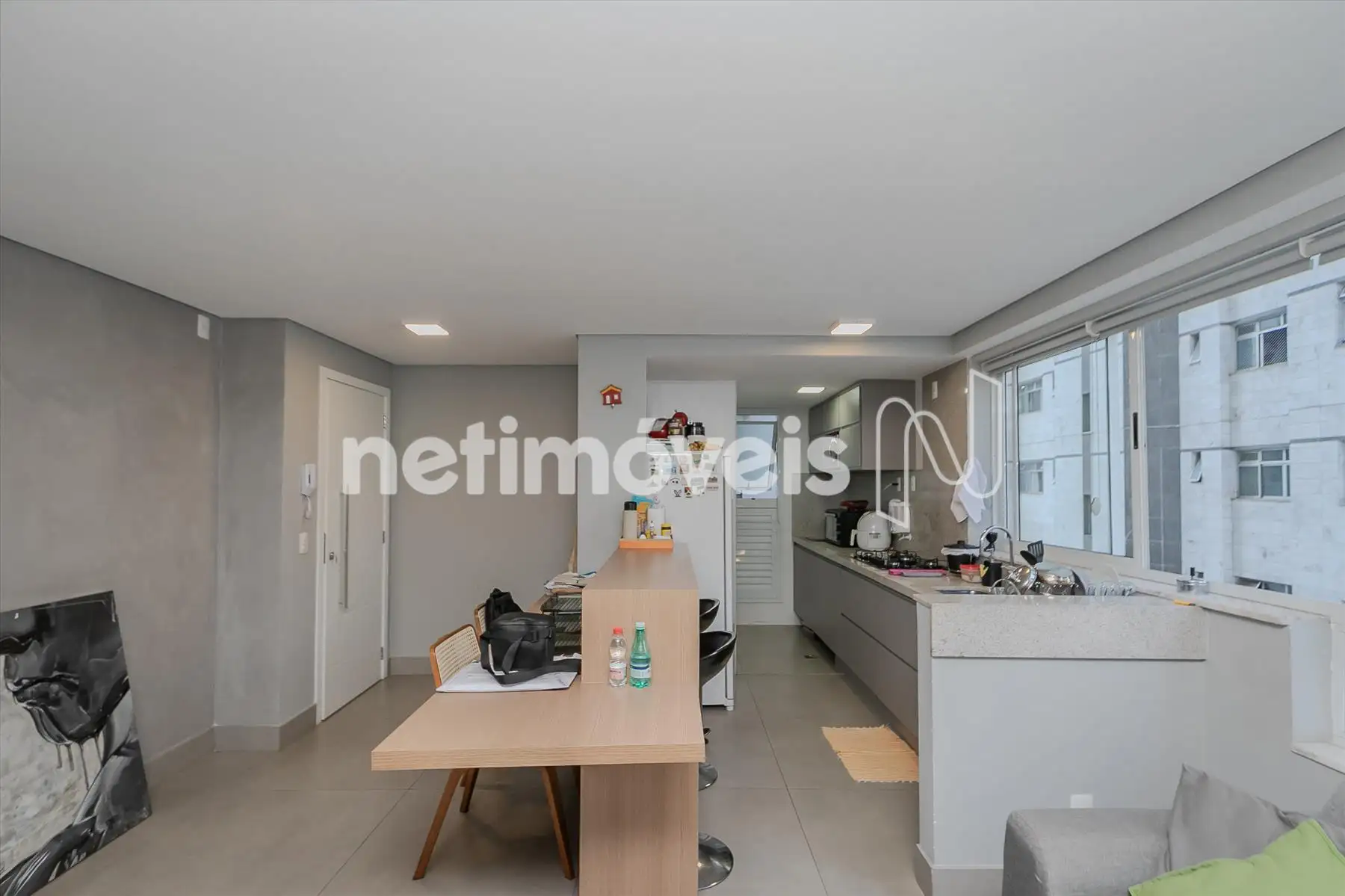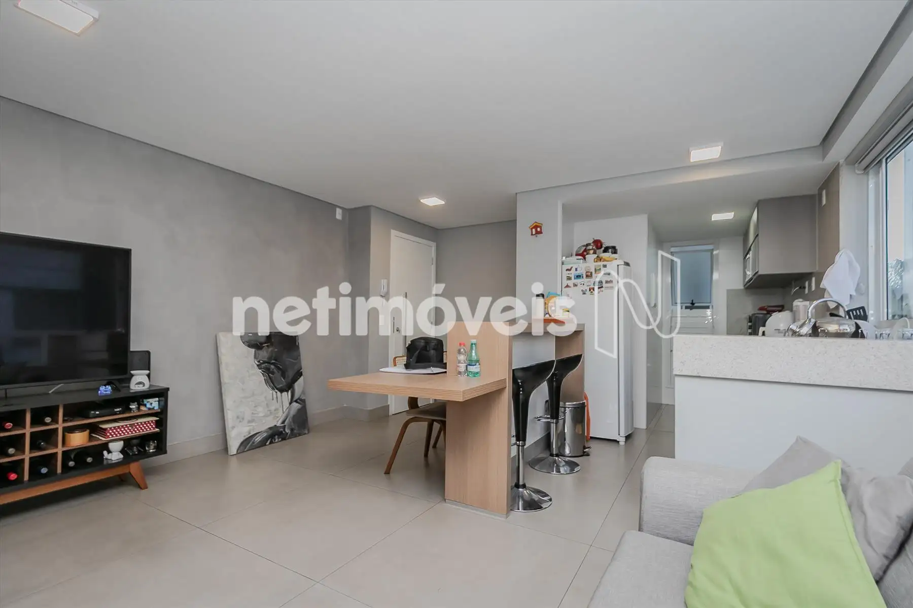 - Cozinha/área de serviço com armários (piso em porcelanato);