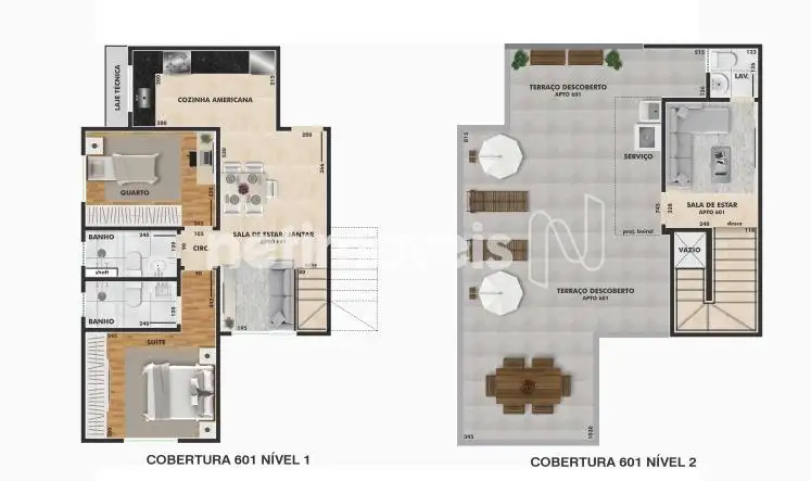 - Apartamento com sala para 2 ambientes. Cozinha estilo americana, com área de serviço, 2 quartos sendo 1 suíte e banho social. Cobertura com 55m². São 2 vagas de garagem em linha. Piso em cerâmica nas salas e quartos, revestimento parcial nas áreas molhadas, preparação de laje técnica para ar-condicionado na suíte, tanque em louça, pias, lavatórios e bancadas em granito.