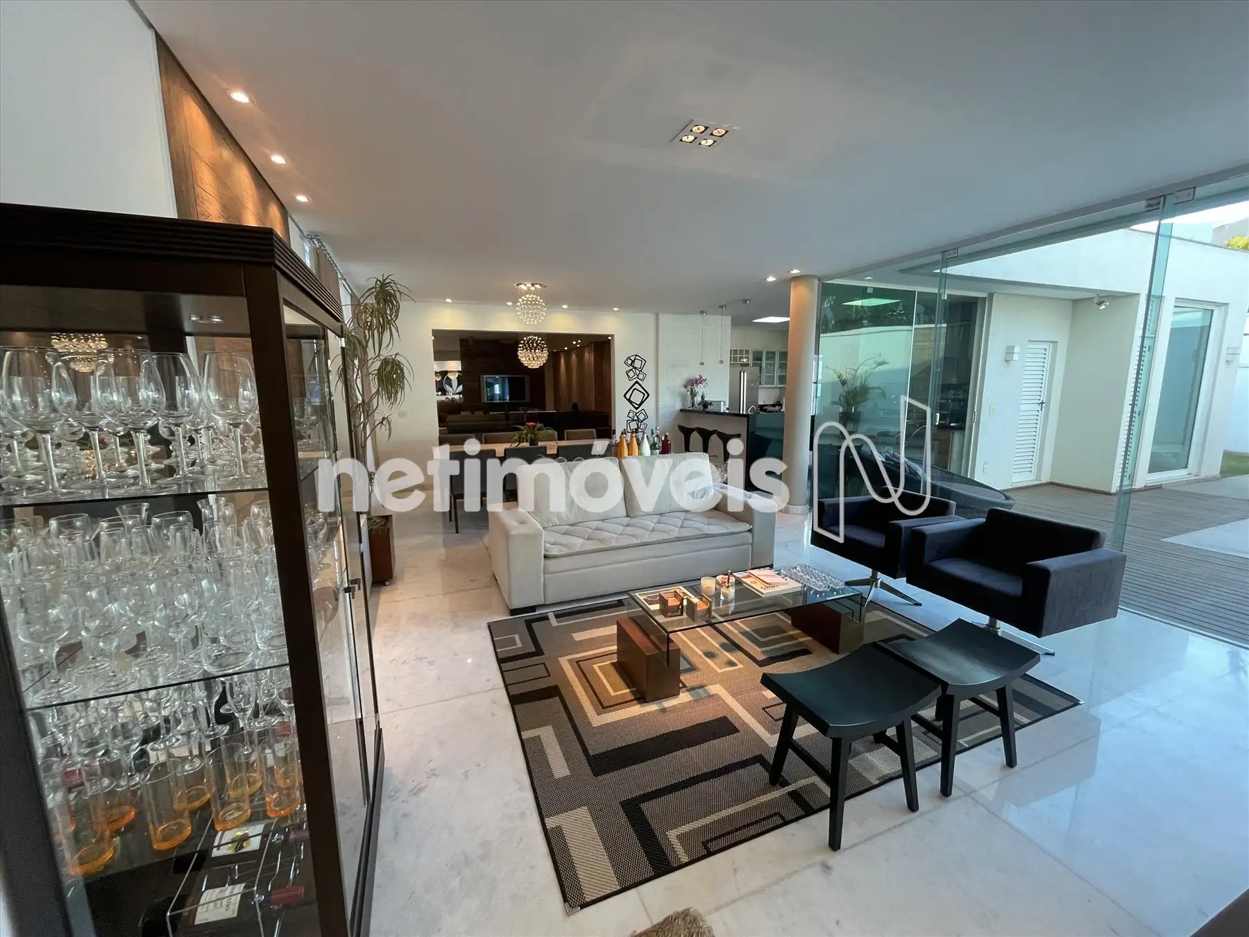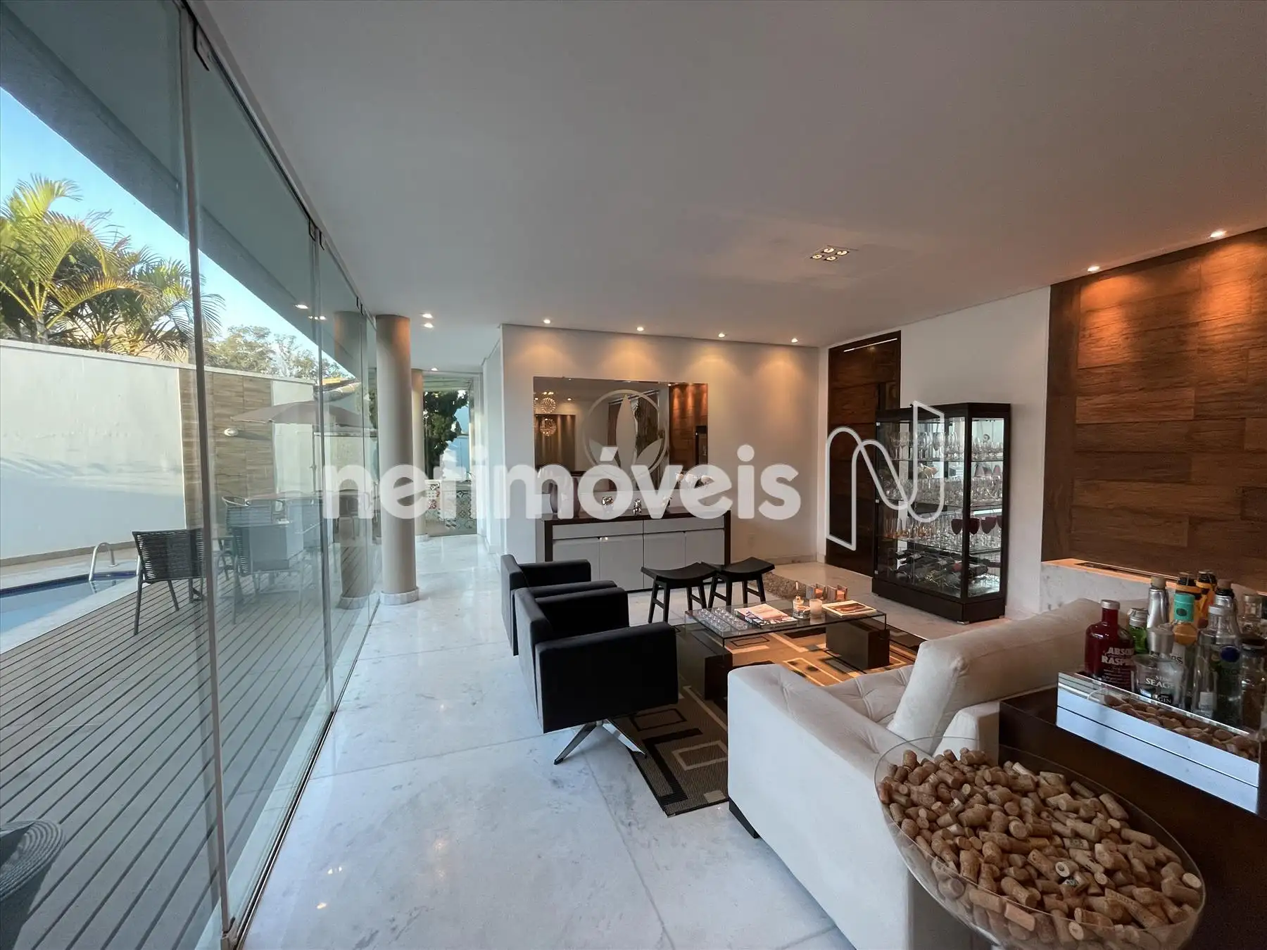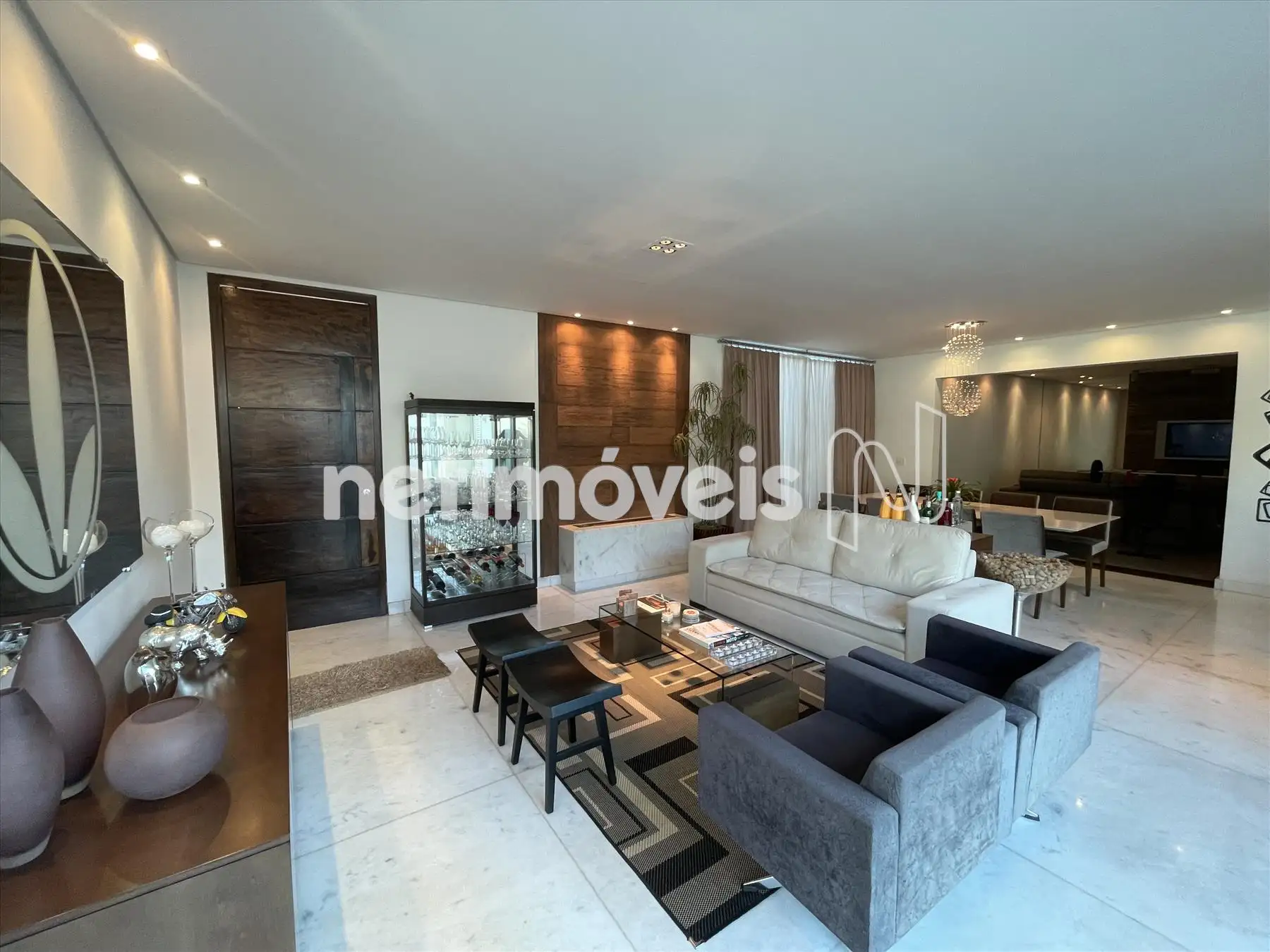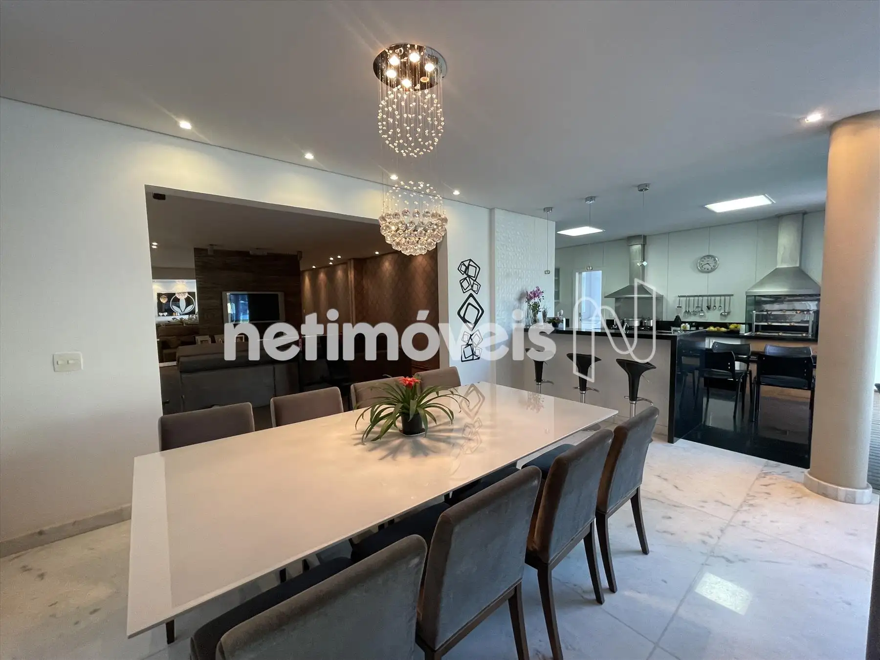 Sala espaçosa, integrada para até 3 ambientes com lareira a gás, piso em mármore branco e cinema;