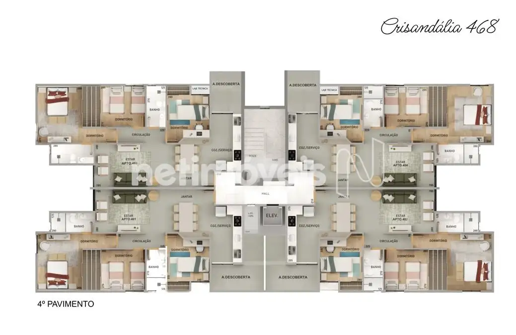 Prédio de esquina, torre única, fachada revestida, elevador, 4 unidades por andar, 2 vagas de garagem cobertas por apartamento, preparação para ar condicionado, água e gás individualizados. Acessibilidade. Cada pavimento com 4 apartamentos. Vaga com carregamento para carro elétrico.