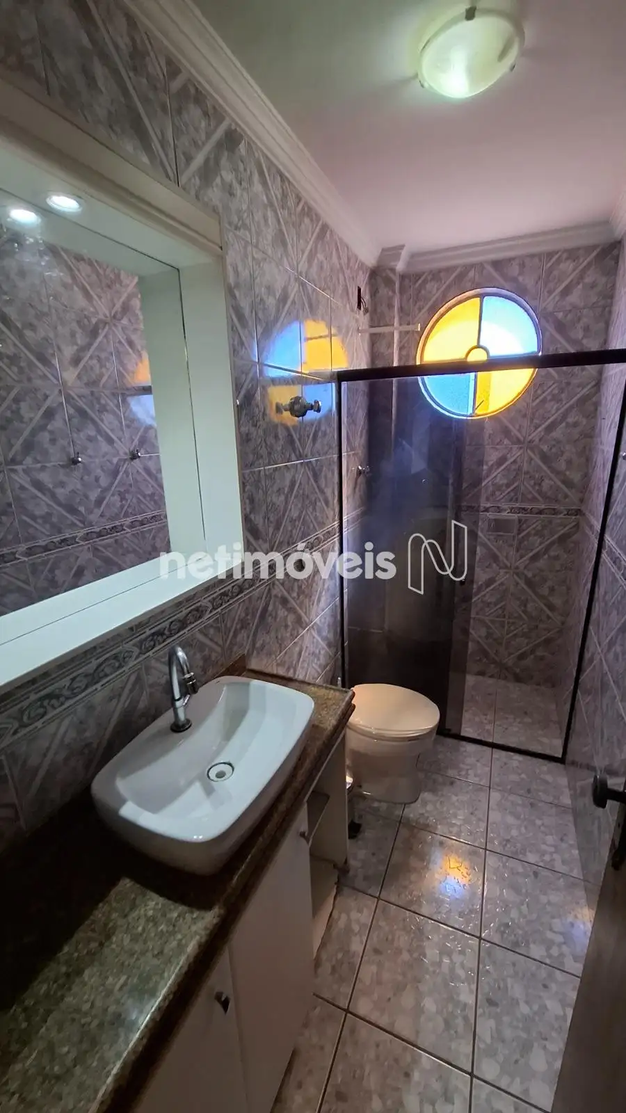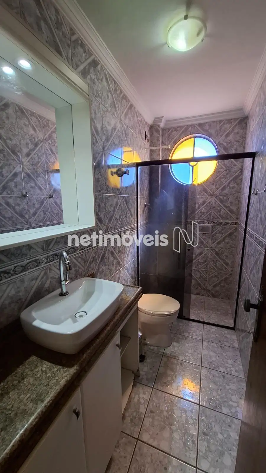- Banheiro social, com box de vidro, espelho e armário planejado