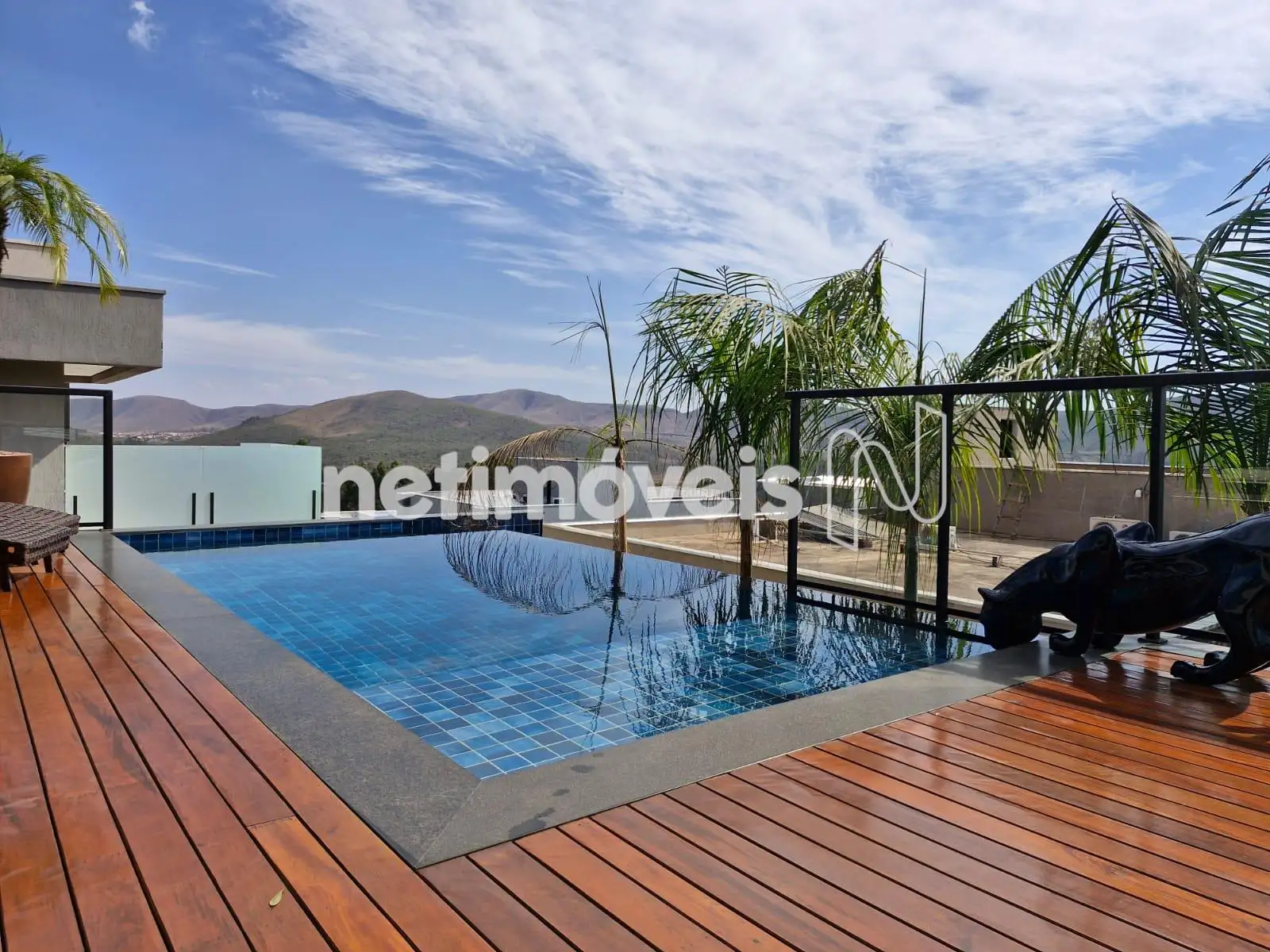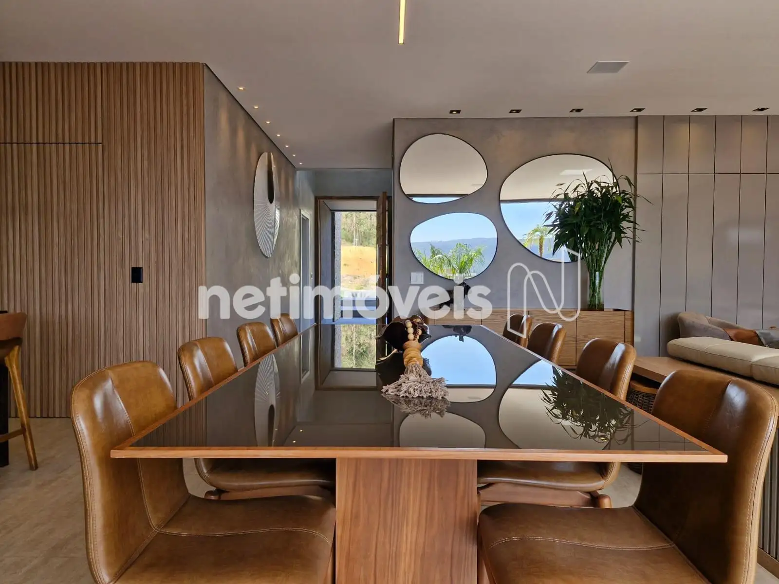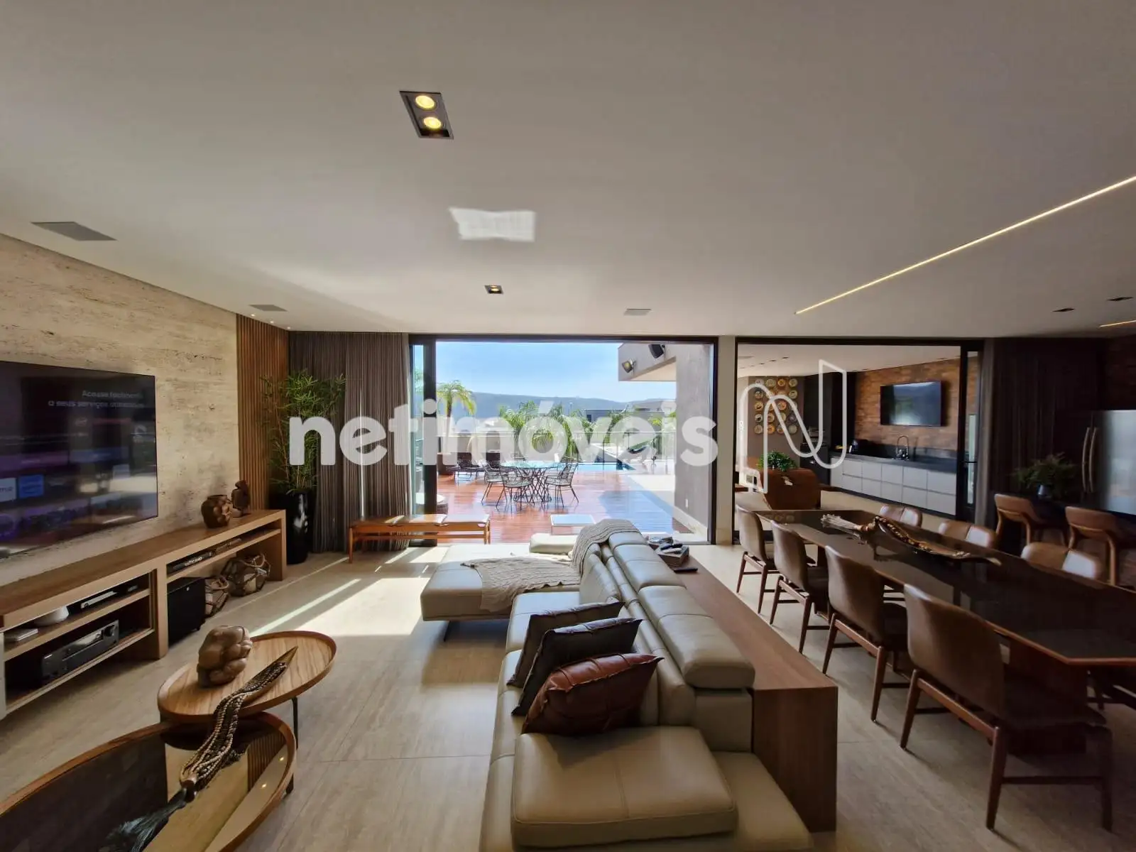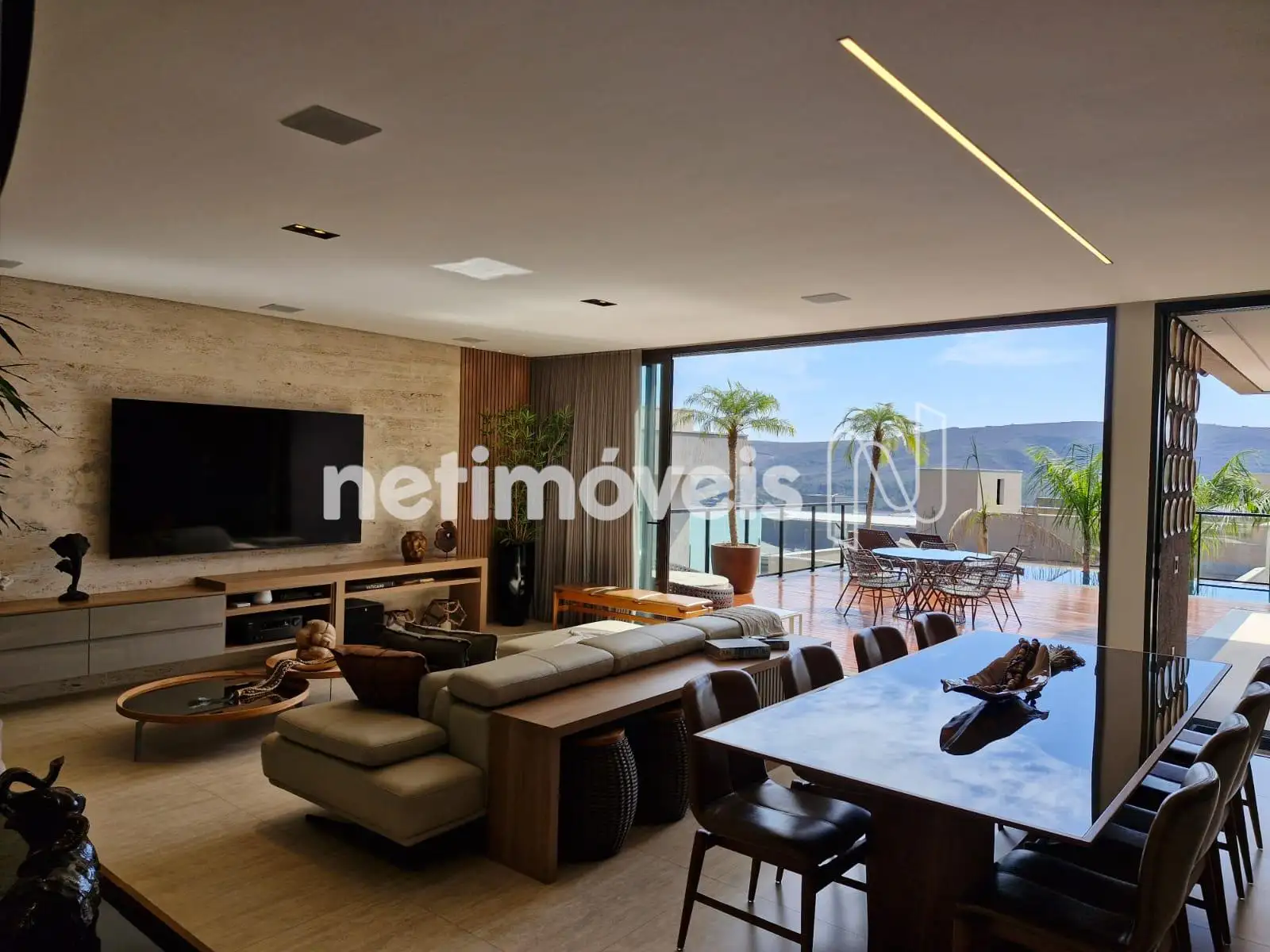 Sala ampla com lavabo, integrada à cozinha em estilo americano, ao espaço gourmet e à área externa com deck de 52,75 m², piscina de 20,59 m² e uma vista panorâmica de tirar o fôlego. A área social é ideal para momentos de lazer e convivência. Conta também com área de serviço com dependência completa de empregada e uma suíte para hóspedes.