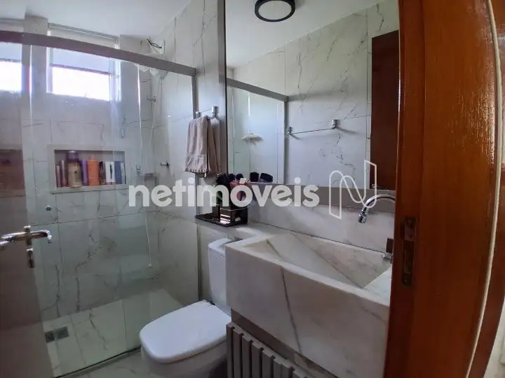 Banheiro com box em vidro temperado, bancada e pia em mármore e armário.