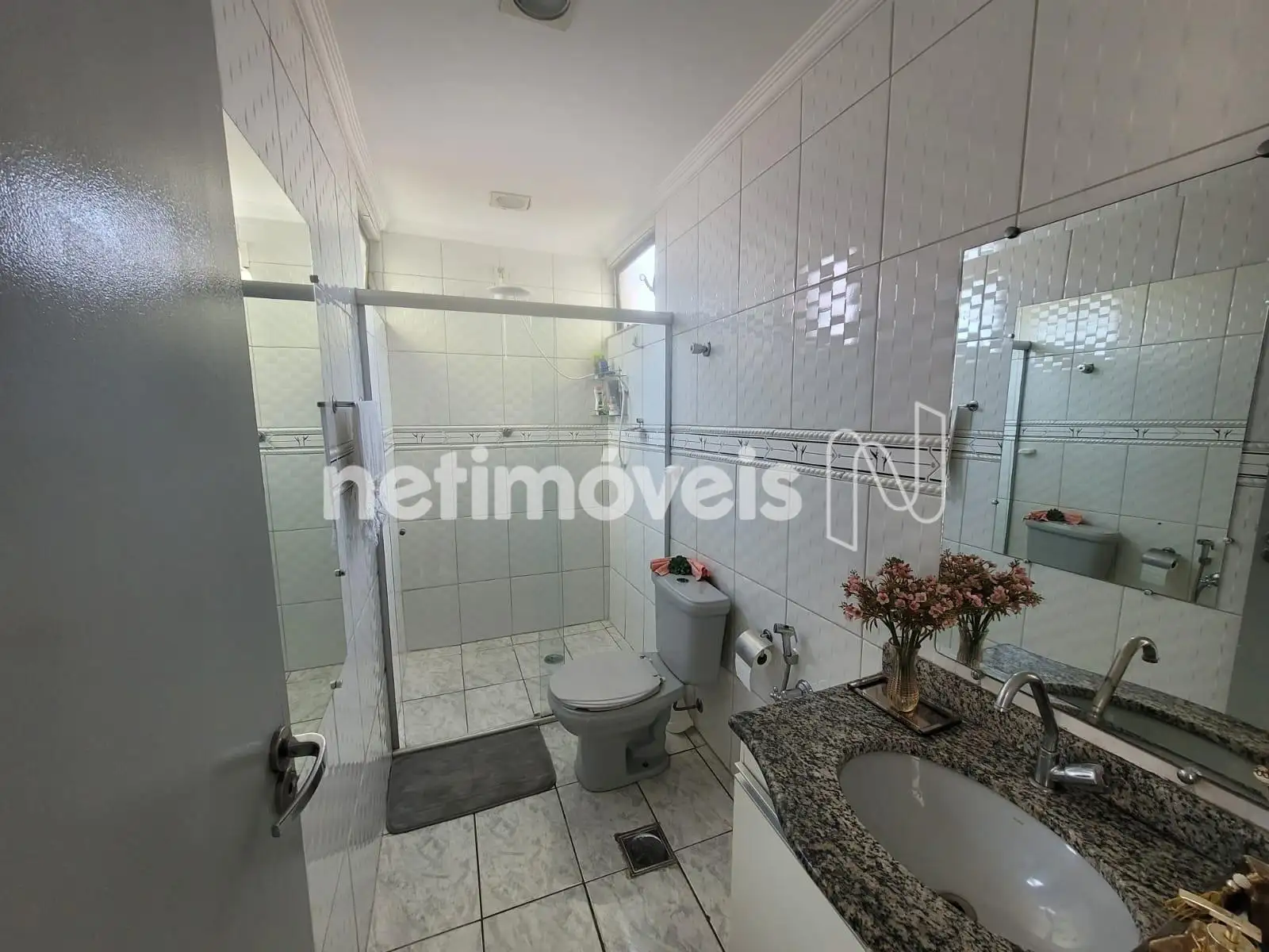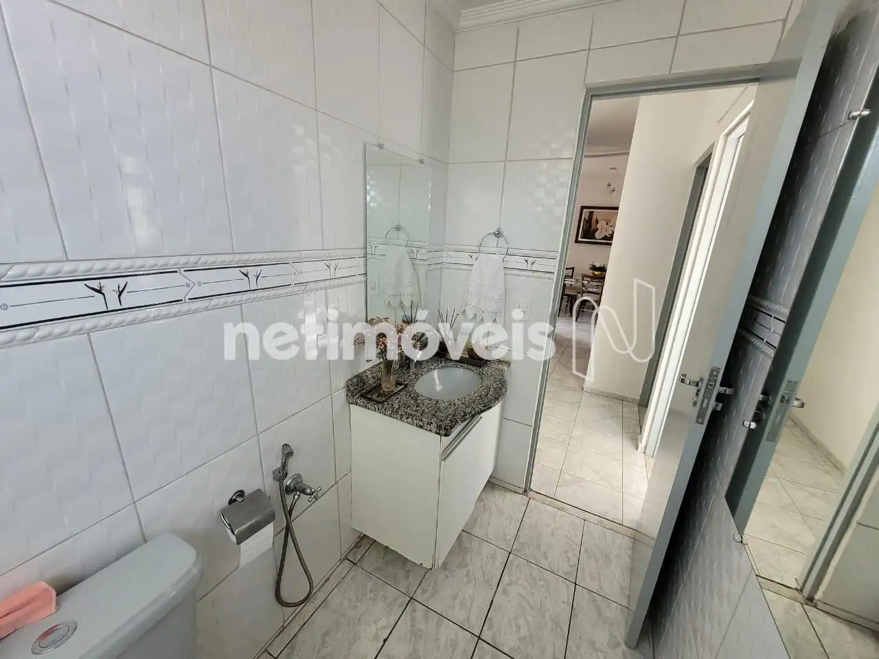 01 Banho social com bancadas em granito e armários.
