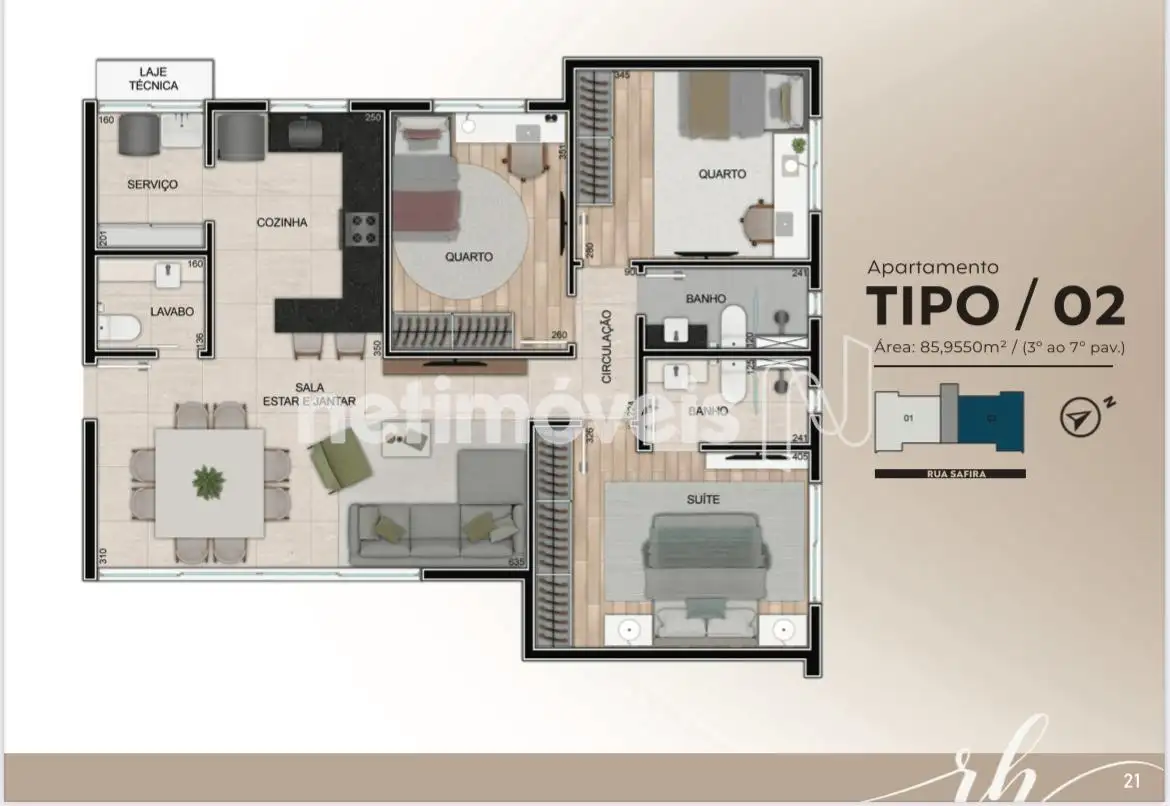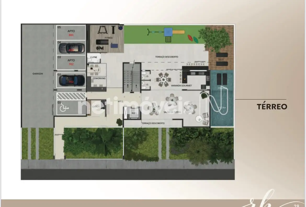 Estrutura do Condomínio: O condomínio oferece uma ampla área de lazer, com piscina para adultos e crianças, academia, salão de festas, varanda gourmet e espaço coworking. Recursos sustentáveis, como iluminação em LED e aquecimento solar, complementam a infraestrutura, que também inclui carregamento para carros elétricos.