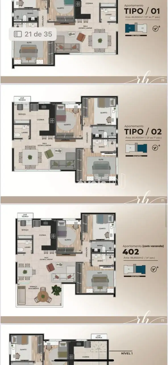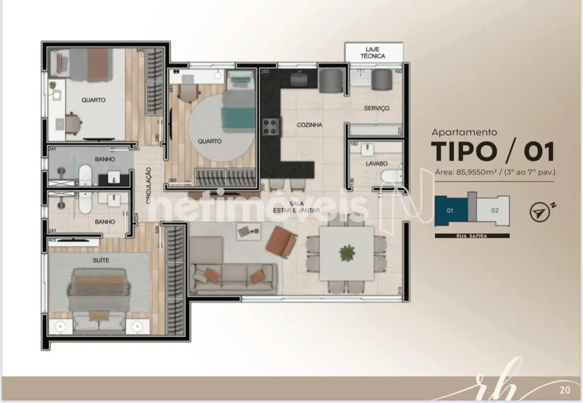 do Imóvel: O apartamento possui uma sala espaçosa para dois ambientes, cozinha bem planejada, área de serviço separada, banheiro social e lavabo. As unidades contam com persianas integradas nos quartos, e medição individual de água e gás, além de infraestrutura para ar-condicionado.