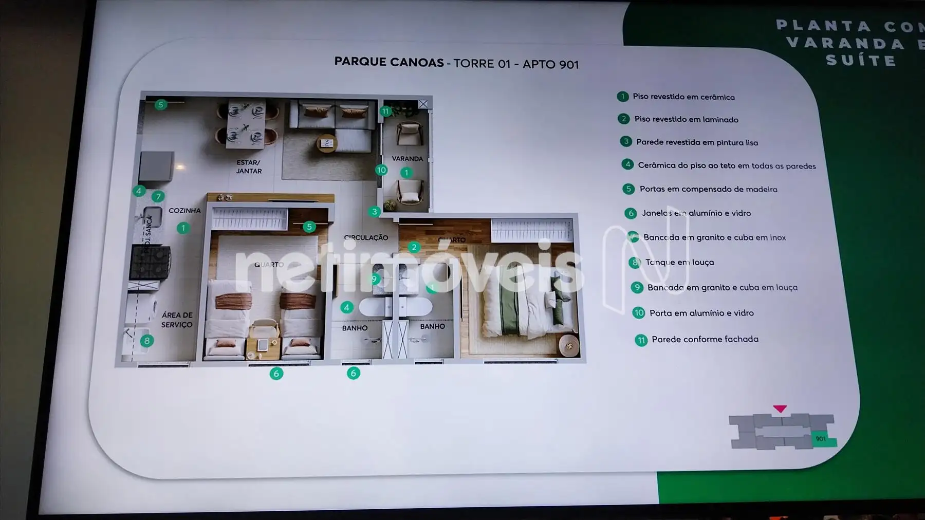 Apartamento composto por: Na dimensão de 45,69m² possui 2 quartos, sendo um suíte, com piso em laminado, circuito para ar-condicionado no quarto principal, sala para 02 ambientes, varanda, banho social com cerâmica até o teto, cozinha com pia em inox e acabamento em granito e cerâmica até o teto, e área de serviço com tanque em louça, bancadas em granito.