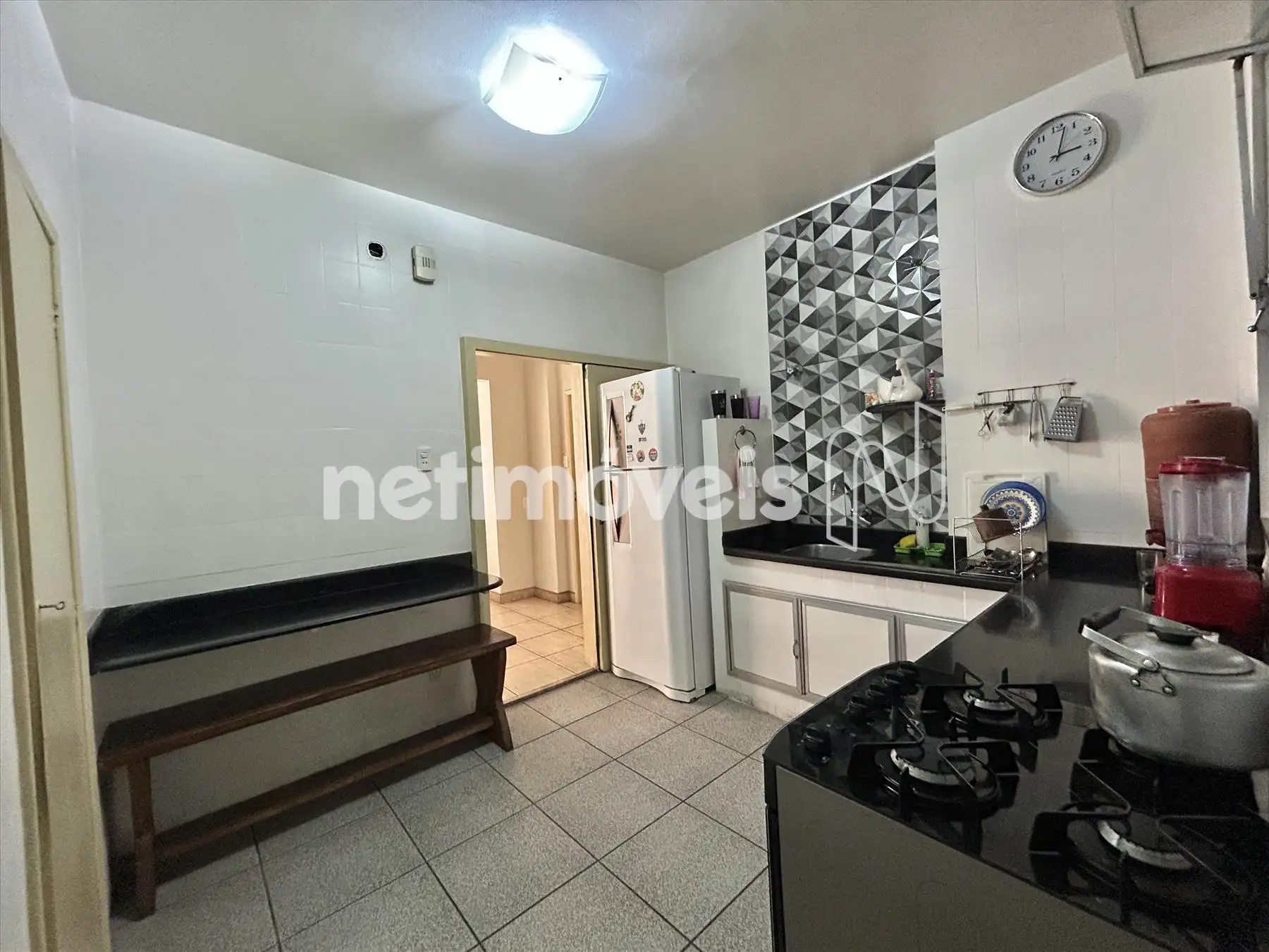 - Cozinha piso em cerâmica, bancada em granito com armários e bancada para café.