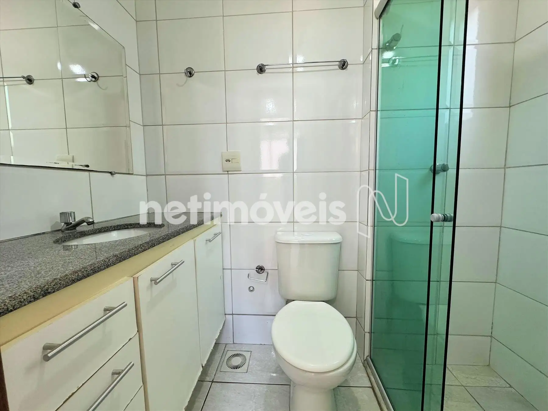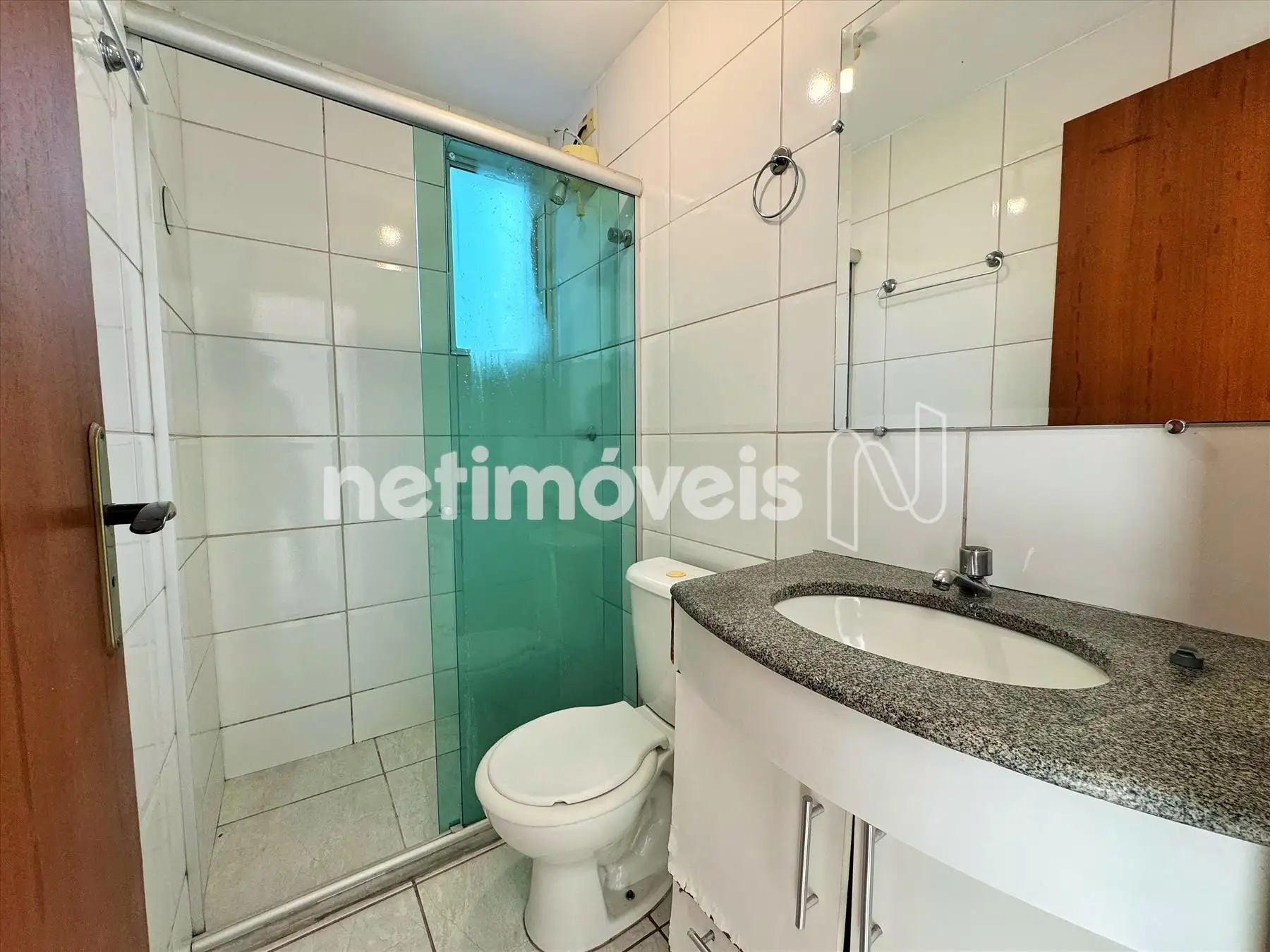 Banho social completo, com armário, bancada em granito e box blindex;