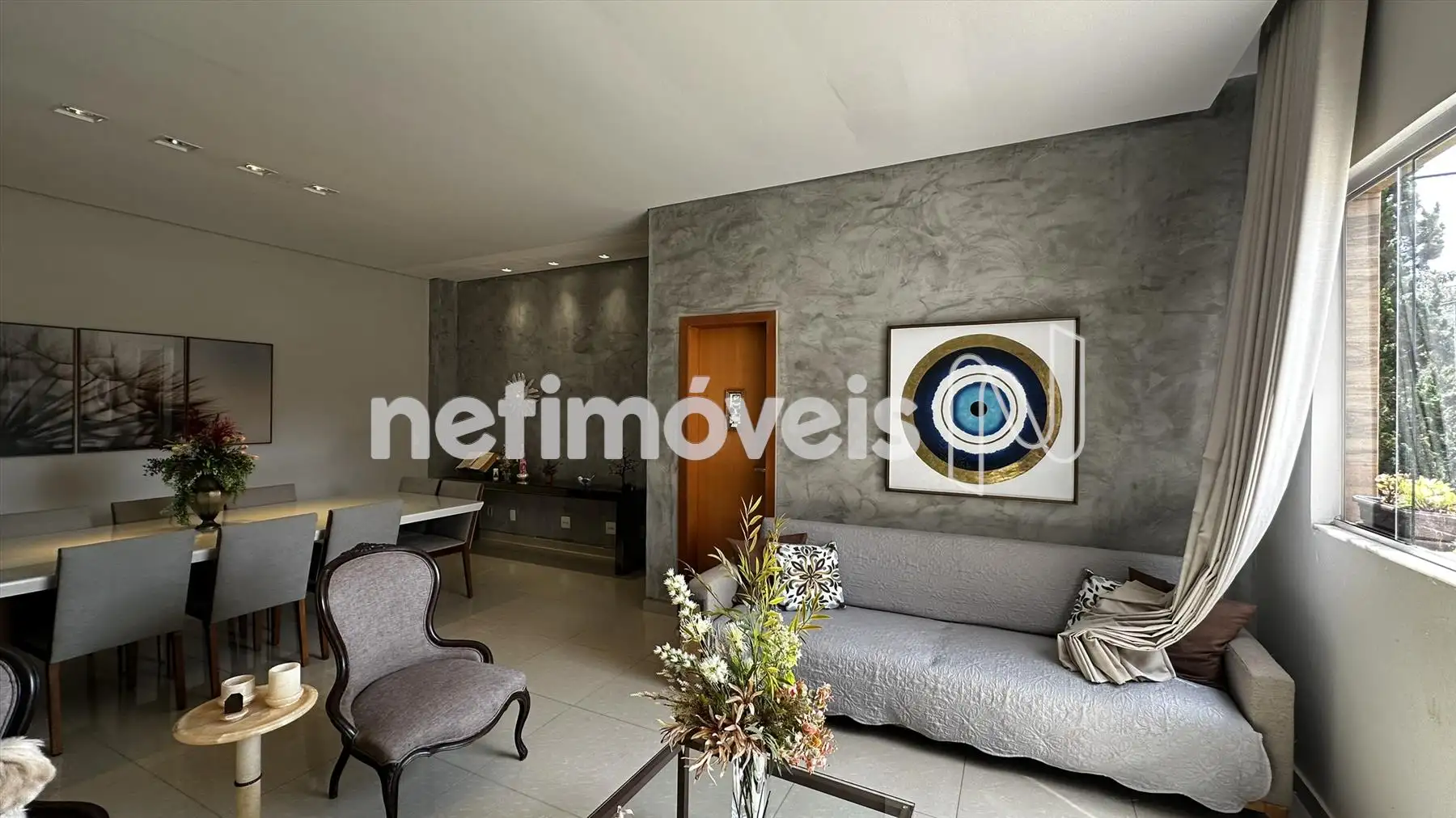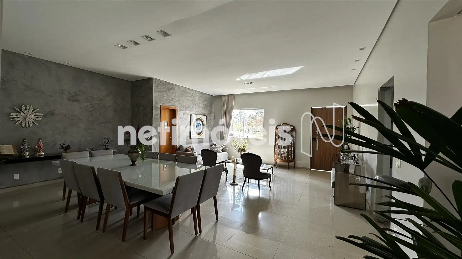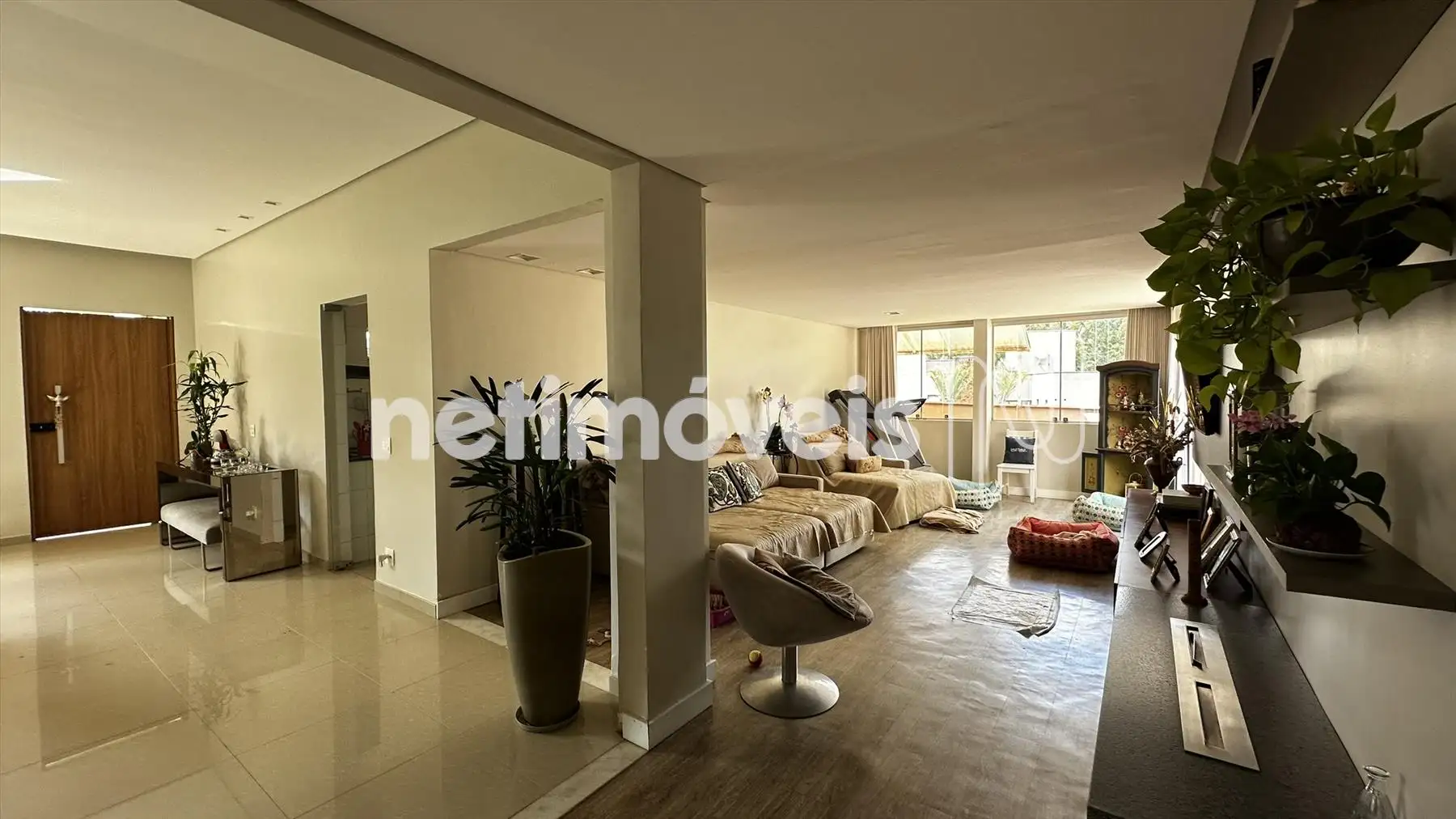 A ampla sala com dois ambientes, cozinha montada, suite master e 3 quartos com banho social, área externa com piso e jardins nos fundos e na frente.