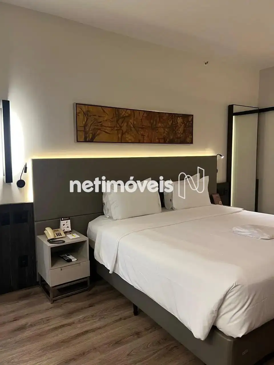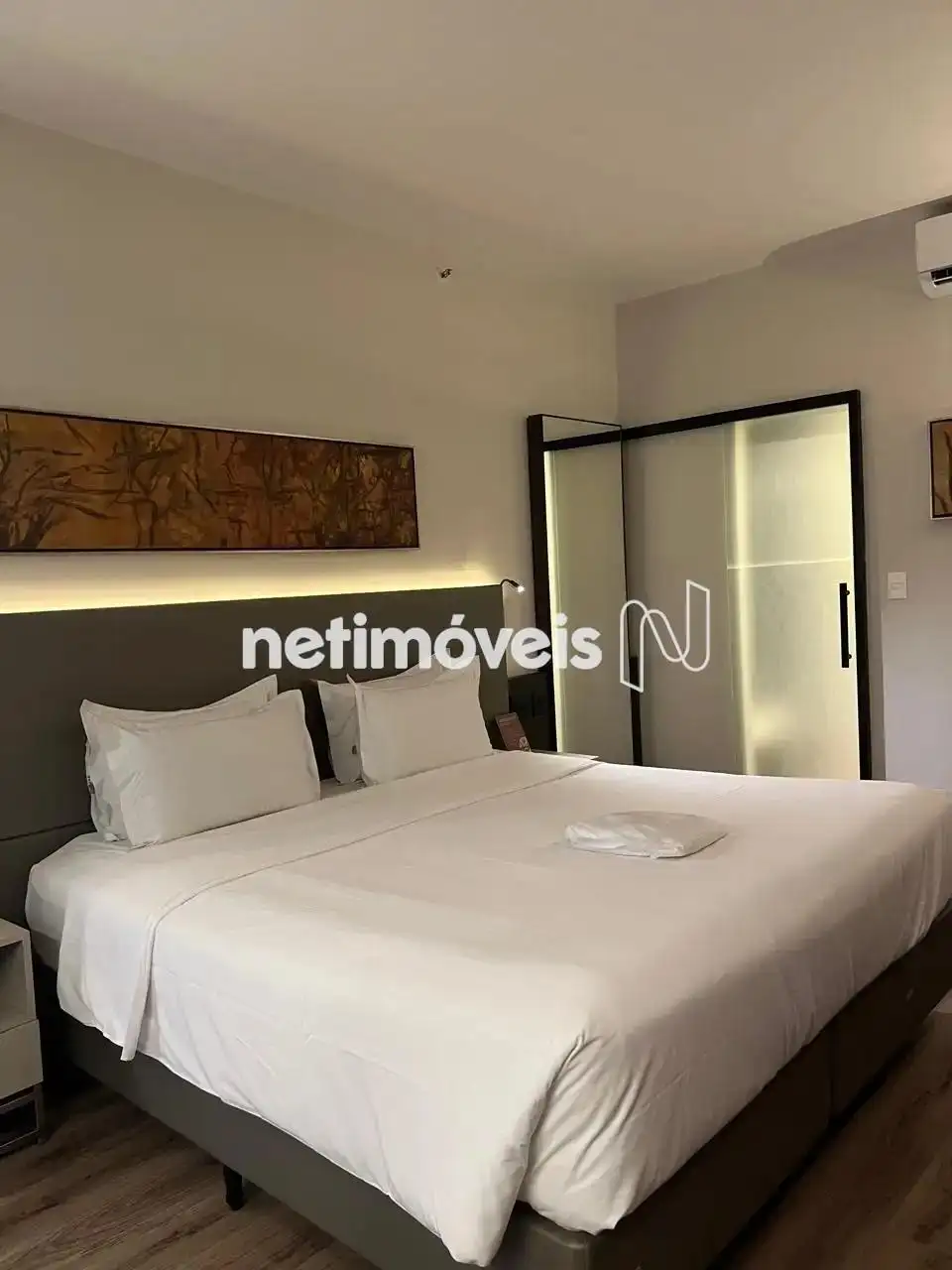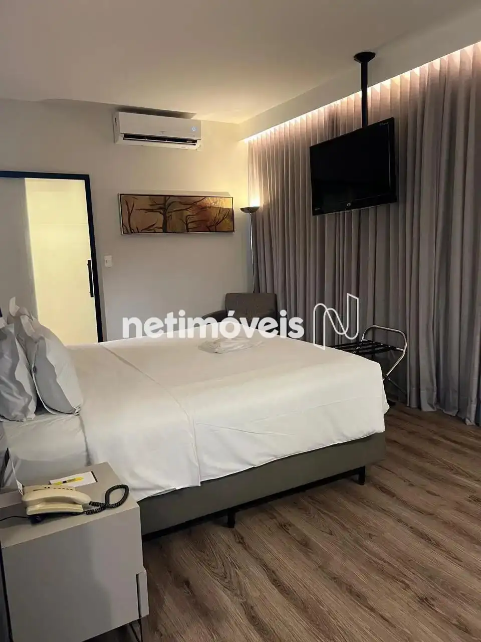 O imóvel possui 01 quarto equipado com Wi-Fi, televisão, cama confortável, ar condicionado e frigobar. O ambiente é iluminado por duas amplas janelas que proporcionam uma agradável luz natural. A suíte conta com armários planejados e uma rouparia, garantindo praticidade e organização.