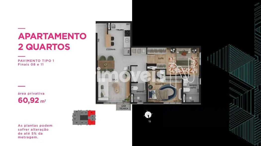 - Quartos e suítes piso laminado, exceto em unidades tipo Studio que o piso é porcelanato